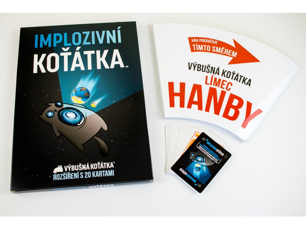 Toto rozšíření nabízí úplně nové druhy karet, které skvěle obohatí vaši originální hru Výbušná koťátka. Naleznete zde například karty s efektem změny směru hry nebo možností pozměnit budoucnost. Čeká na vás také karta Implozivního koťátka - nová šance, jak hanebně umřít a límec hanby, který označí chudáka, který pořádně nesleduje hru. Nejen to vám nabídne první oficiální rozšíření Implozivní koťátka. 20 nových karet v extra velké krabici prostě musíte mít! Díky tomuto rozšíření si hru můžete zahrát až v 6 hráčích!