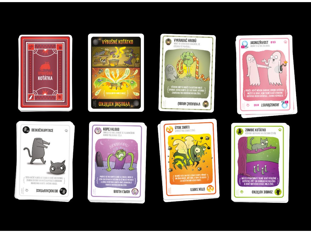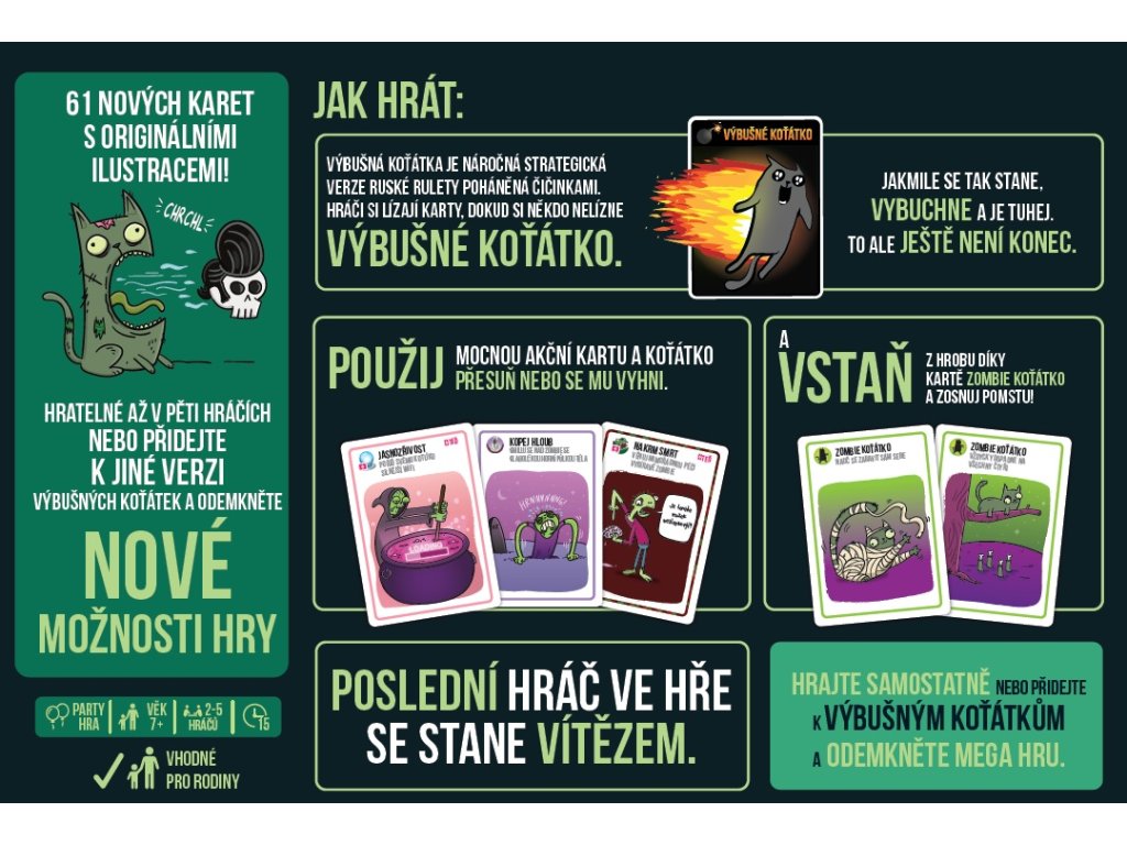 Pro fajnšmekry a majitele jakékoliv základní hry Výbušná koťátka je tu monstrózní varianta hry s názvem Zombie apokalypsa, kterou si zahraje až 9 lidí najednou: https://www.explodingkittens.com/pages/how-to-play-zombie-kittens V odkazu také najdete návod, jak si Zombie koťátka zahrát plnohodnotně i ve dvou hráčích.