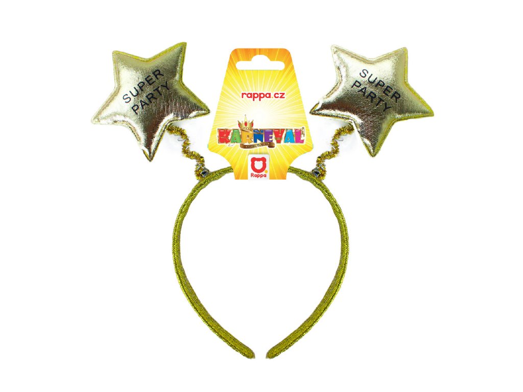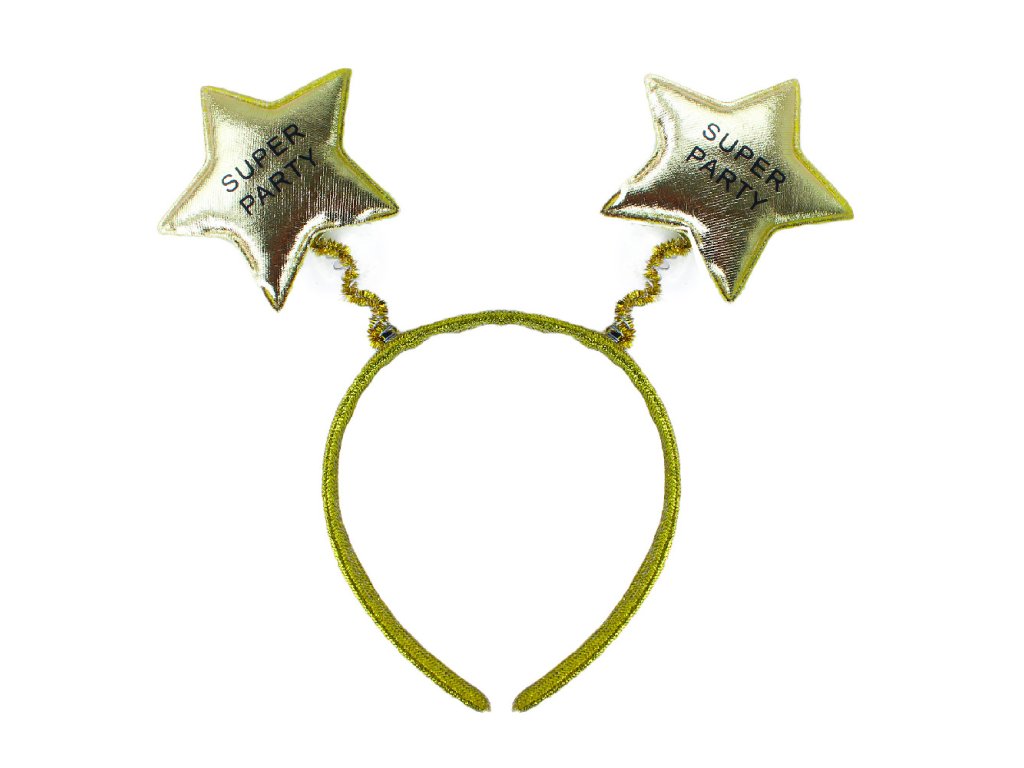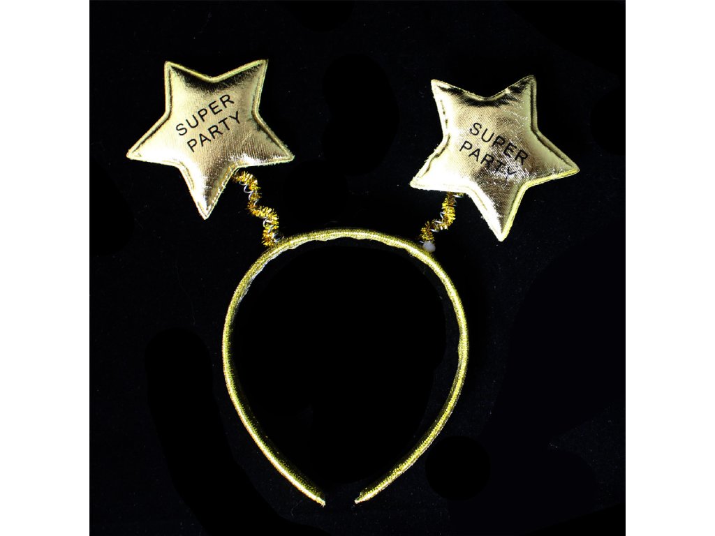 Karnevalová čelenka ve zlaté barvě je zdobená hvězdičkami s nápisem SUPER PÁRTY. Hvězdy jsou k čelence připevněny pomocí pružinek.
