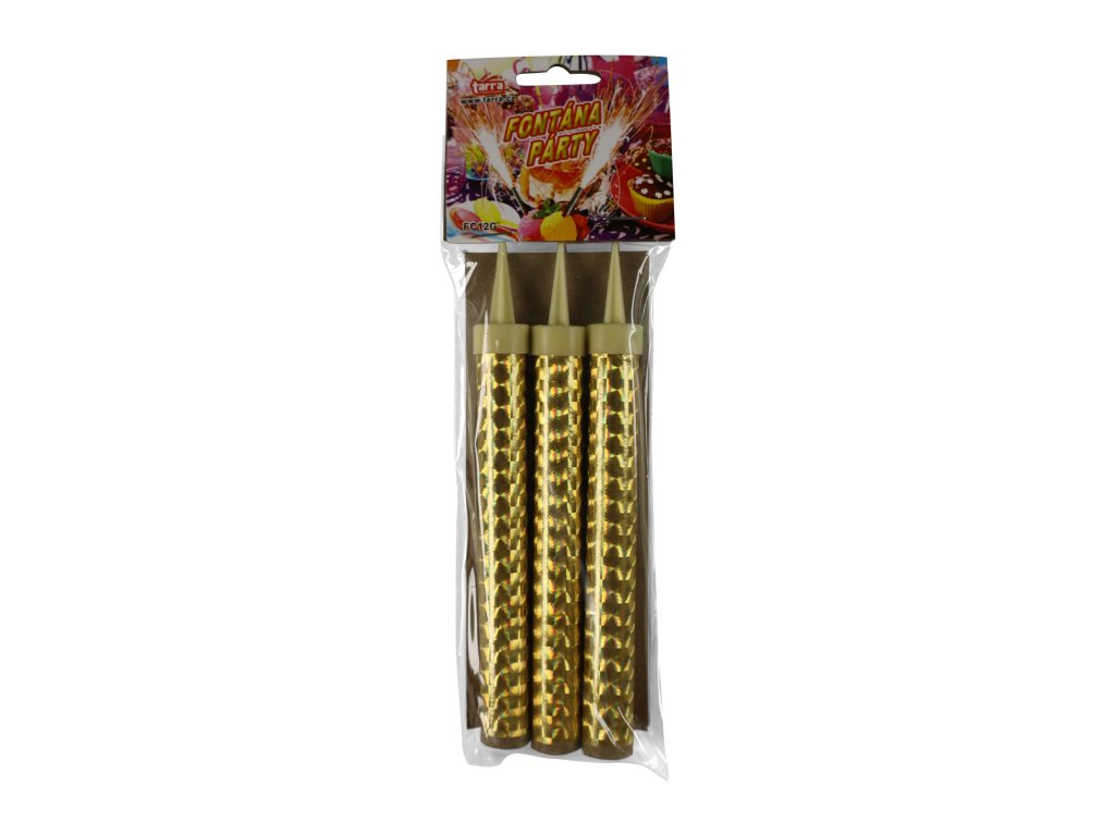 Žádná párty se neobejde bez těchto párty fontán! Jedno balení obsahuje 3 kusy barevné párty fontány o délce 12 cm s efektem zlatých hvězdiček. Délka trvání 40 sek. Prodáváno pouze po 3 kusech a je určena pouze pro venkovní využití. P210 Chraňte před teplem, horkými povrchy, jiskrami, otevřeným ohněm a jinými zdroji zapálení. Zákaz kouření. P250 Nevystavujte obrušování, nárazům, tření. P280 Používejte ochranné rukavice, ochranný oděv, ochranné brýle. P370 + P380 + P375 V případě požáru: Vykliďte prostor. Kvůli nebezpečí výbuchu haste z dostatečné vzdálenosti P372 Nebezpečí výbuchu.