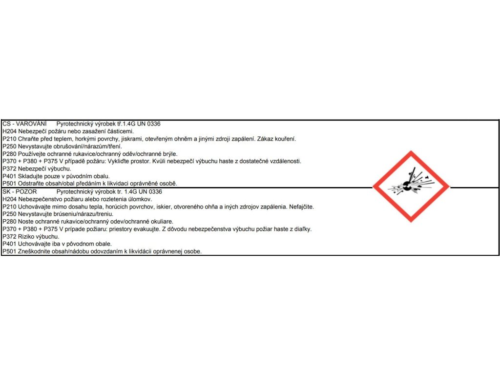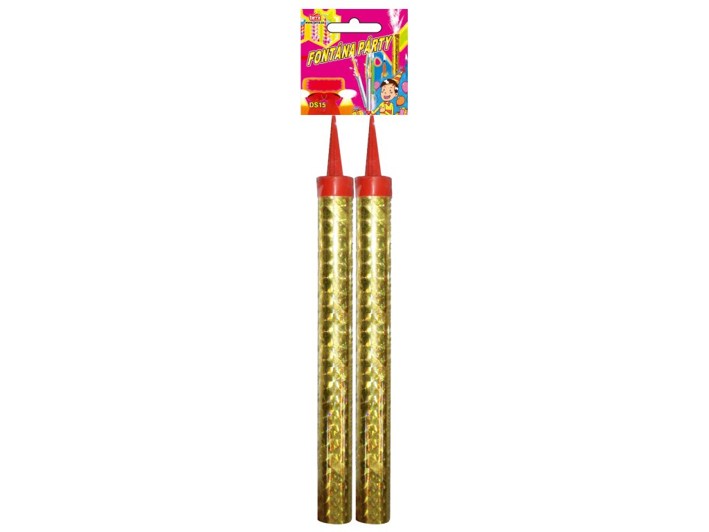 Žádná párty se neobejde bez těchto párty fontán! Jedno balení obsahuje 2 kusy barevné párty fontány o délce 15 cm s efektem zlatých hvězdiček. Délka trvání 50 sek. Prodávána pouze po 2 kusech a je určena pouze pro venkovní využití. P210 Chraňte před teplem, horkými povrchy, jiskrami, otevřeným ohněm a jinými zdroji zapálení. Zákaz kouření. P250 Nevystavujte obrušování, nárazům, tření. P280 Používejte ochranné rukavice, ochranný oděv, ochranné brýle. P370 + P380 + P375 V případě požáru: Vykliďte prostor. Kvůli nebezpečí výbuchu haste z dostatečné vzdálenosti P372 Nebezpečí výbuchu. P501 Odstraňte obsah, obal předáním k likvidaci oprávněné osobě