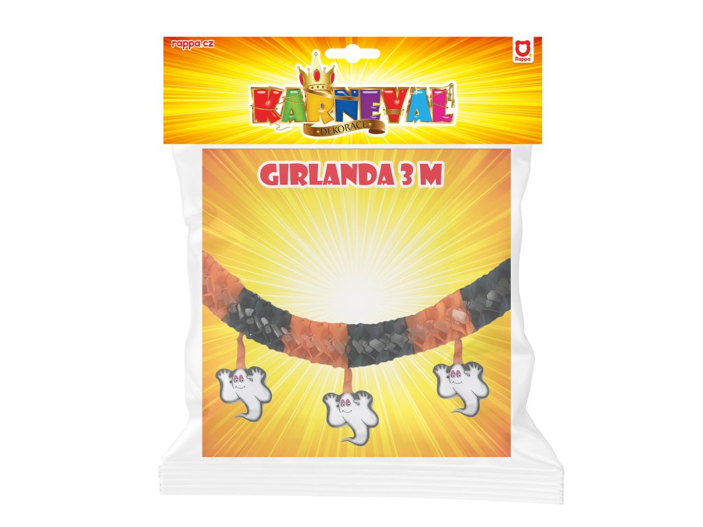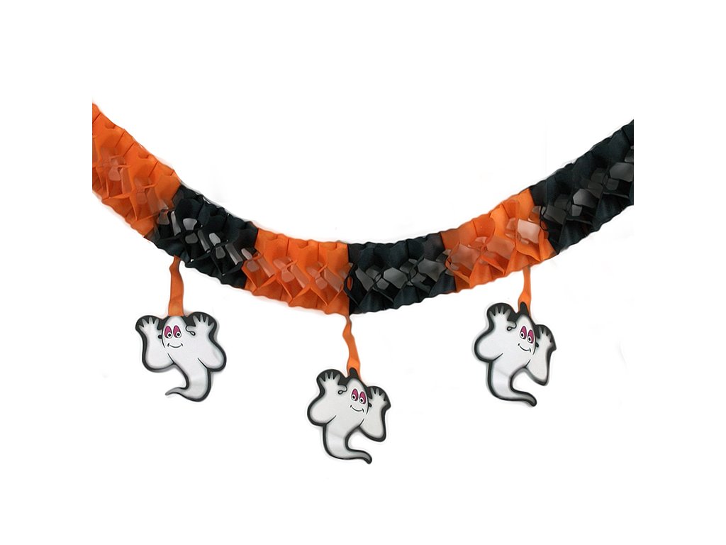 Stylová girlanda je perfektní ozdobou sálů a večírků v období Halloweenu! Černo-oranžová gerlandina s roztomilými duchy je vyrobena z papíru.
