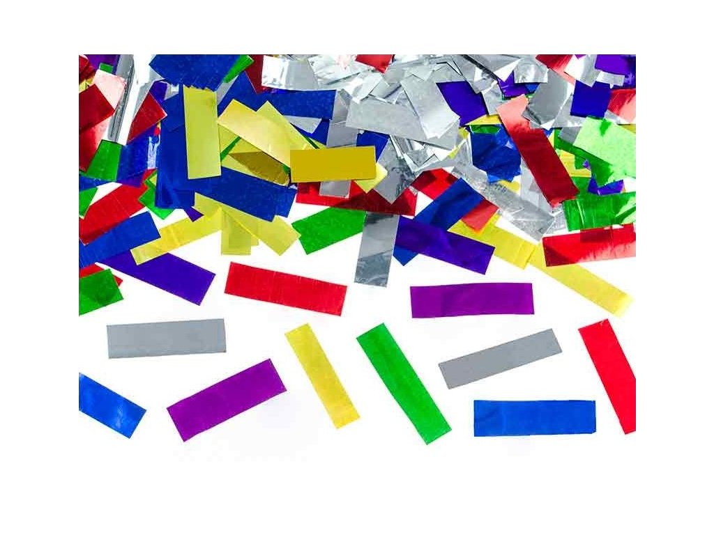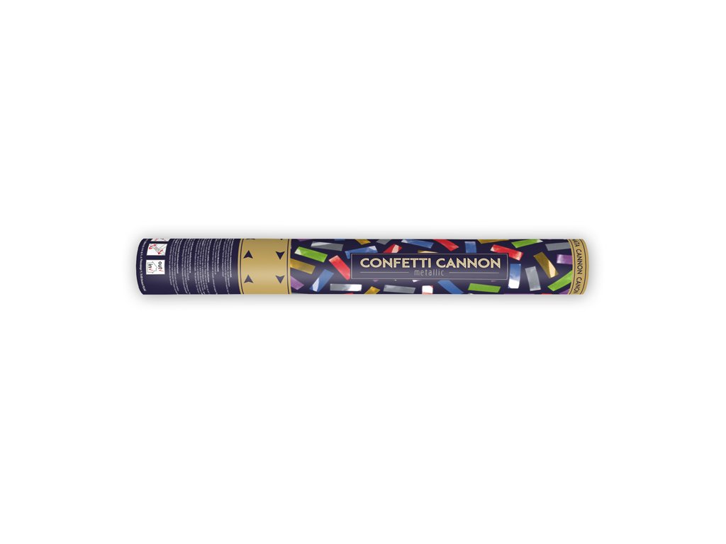 Konfety 40 cm, metalické barevné obdelníčky. Konfety jsou uloženy ve válcovité tubě. Drží se v ruce a ovládají se mechanickým pootočením tubusu. Po vystřelení vyletí barevné obdélníčky do výšky 5 až 8 metrů a rozptýlí se do okolí. Bezpečnost: konfety lze použít ve venkovních i vnitřních prostorách. Bezpečná vzdálenost přihlížejících diváků od tuby konfet je 10 metrů. Iniciace stlačený vzduch. Tubus kov. Manipulace pootočení. Max délka odpálení 5–8 m.