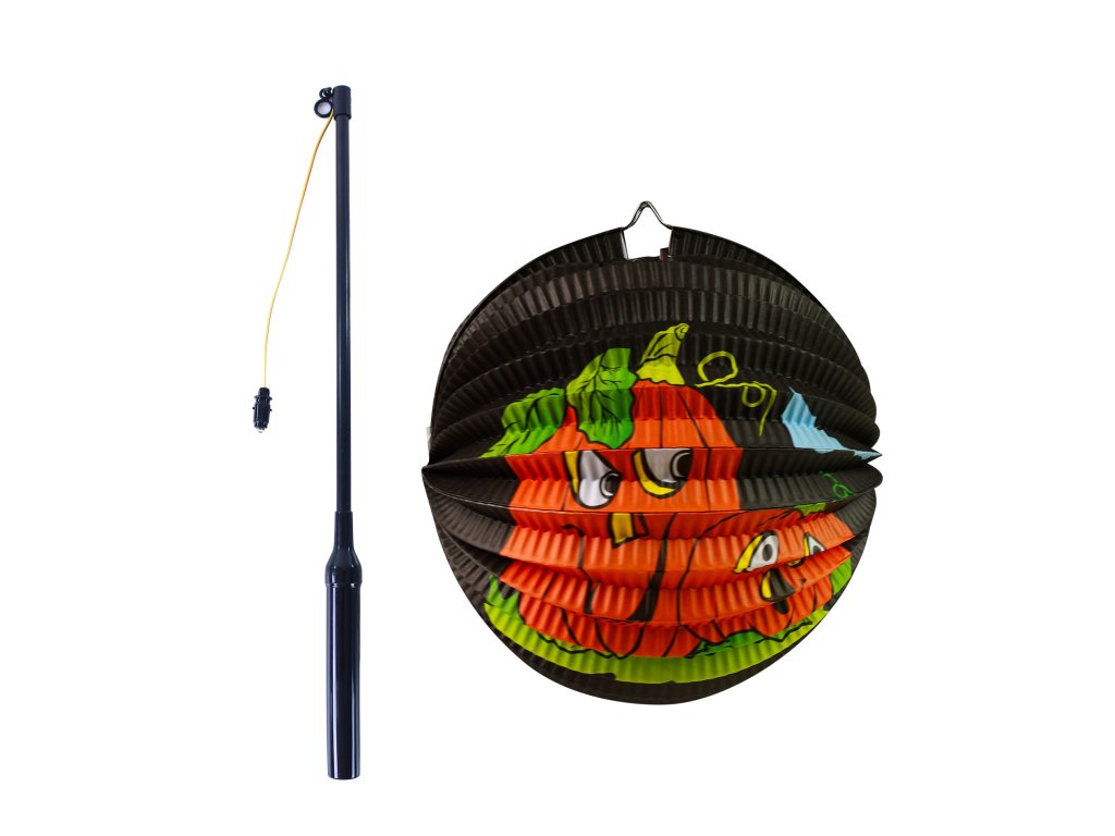 Papírový černý lampion s dýněmi a k němu svítící hůlka! Kulatý lampion je vyroben z papíru a ve spodní části se nachází úchyt pro svíčku. Tento super kousek ti zaručí parádní atmosféru na tvém halloweenském večírku nebo lampionovém průvodu! Hůlka vyžaduje 2 tužkové baterie typu AA, které nejsou součástí balení. Přepnutím spínače na rukojeti hůlka svítí.