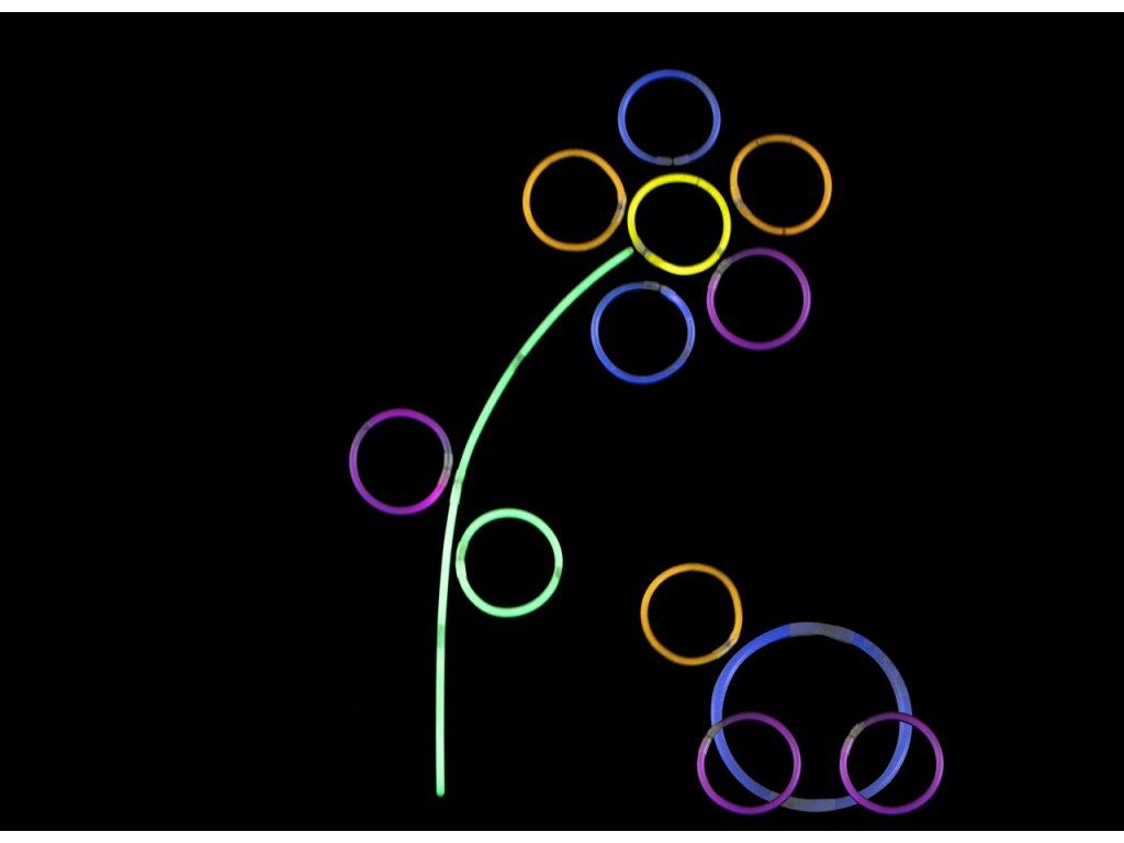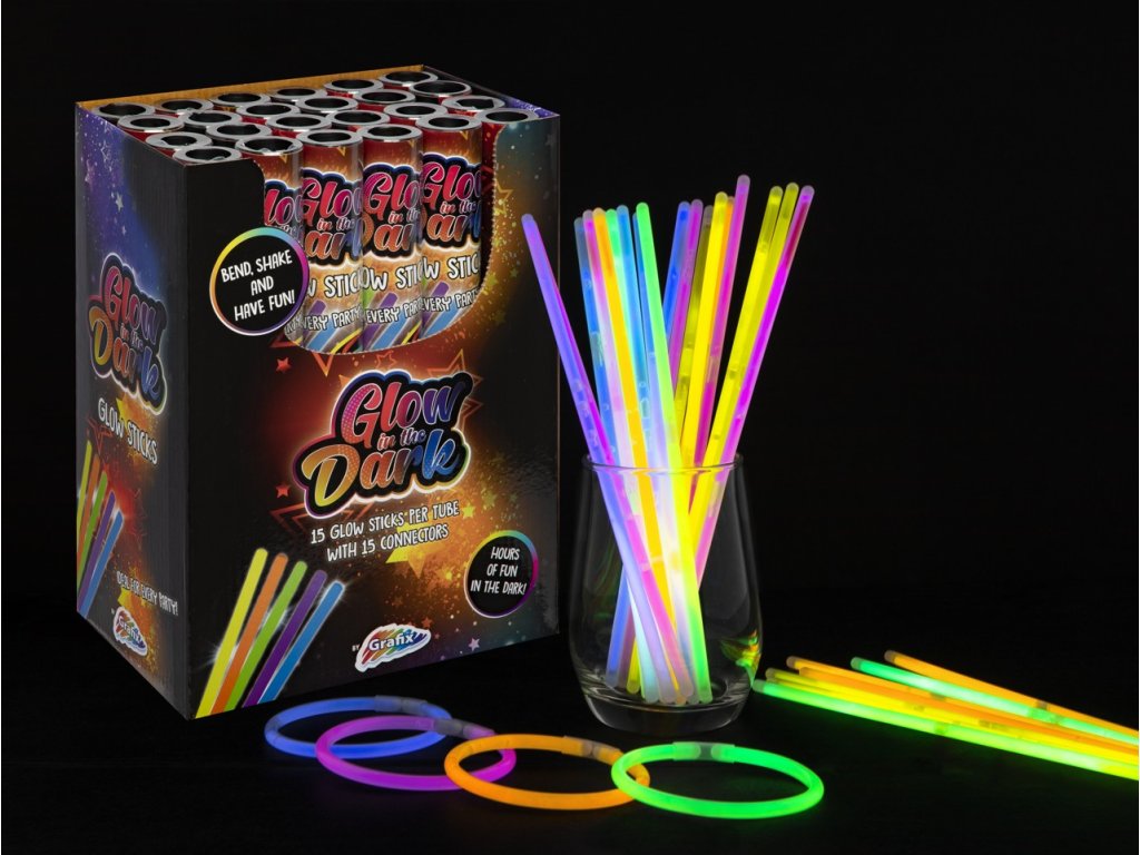 Noční párty může začít. 15 ks svítících tyčinek, které lze propojit pomocí spojovacích částí. Z tyčinky jde uvělat i náramek nebo náhrdelník. Doba svícení cca 6 hodin od zlomení tyčinky.