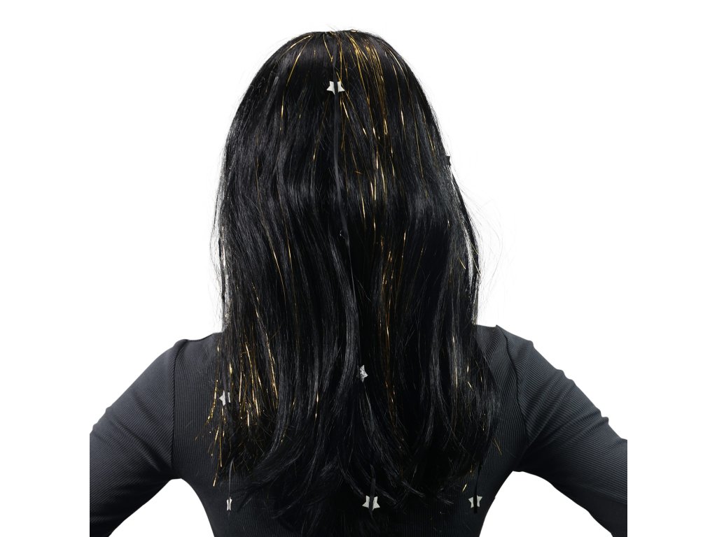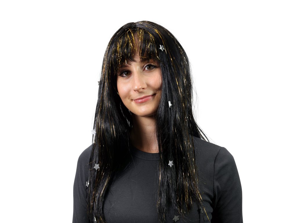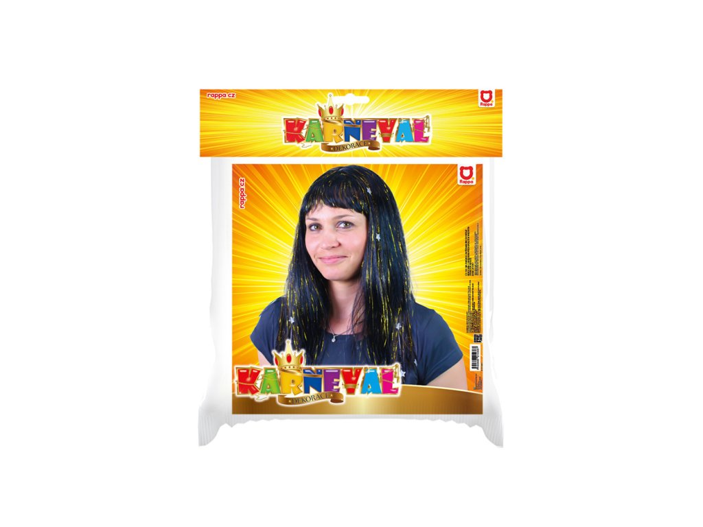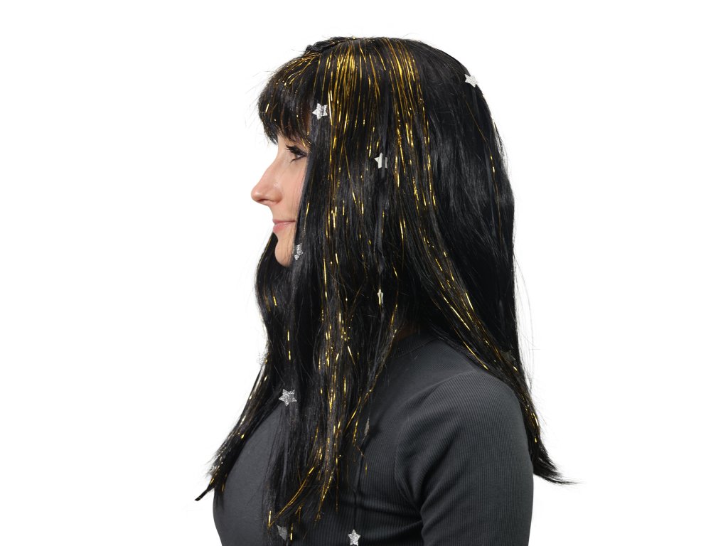 Karnevalová paruka v černé barvě je zdobená zlatými vlásky a stříbrnýma hvězdičkama. Perfektní doplněk na karneval nebo párty!