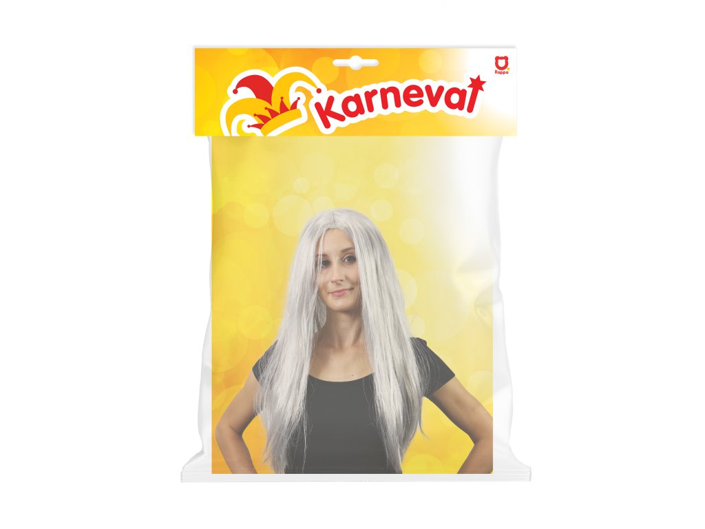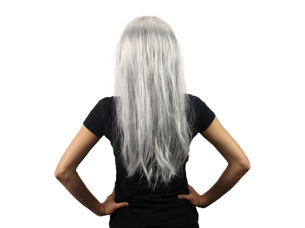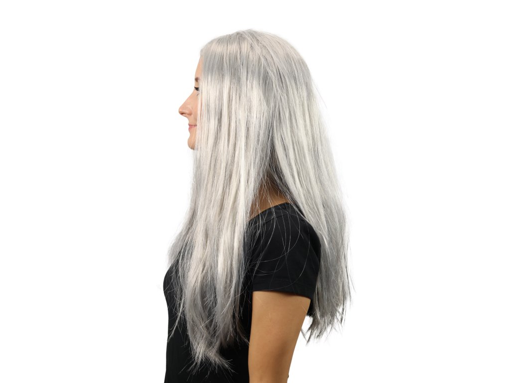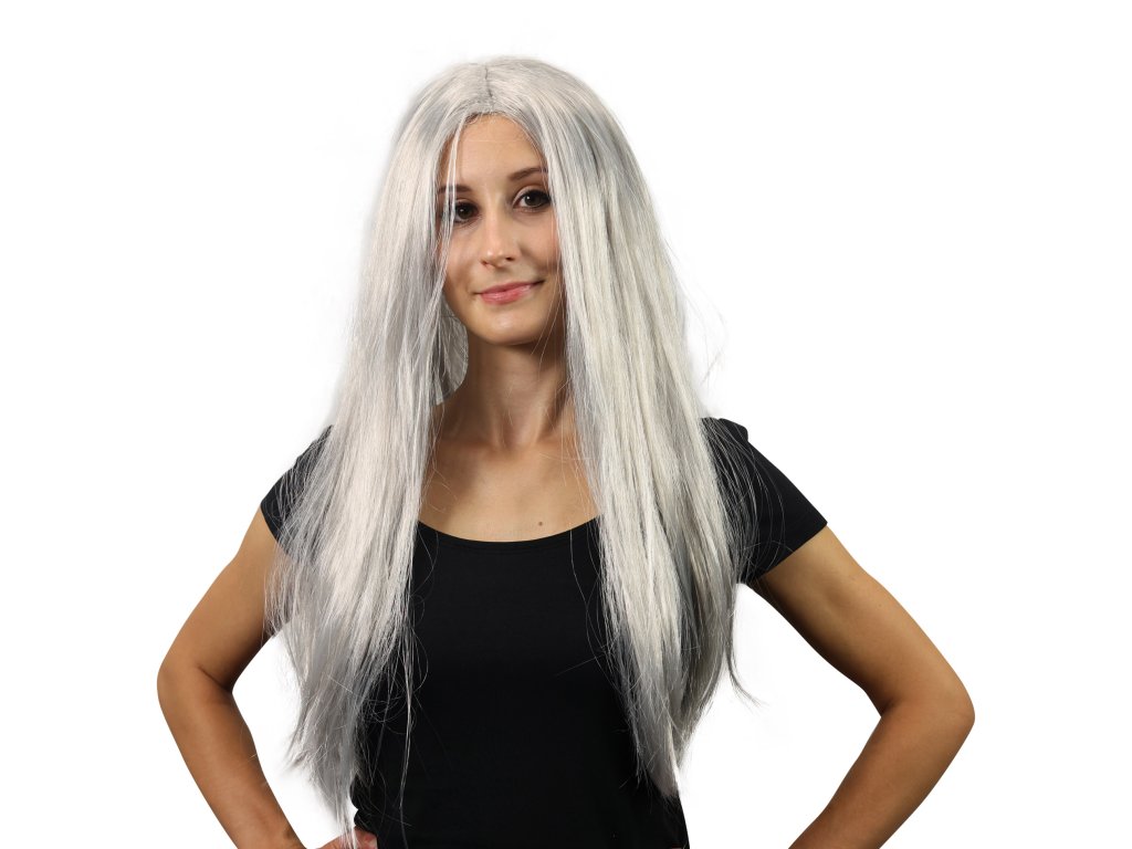 Karnevalová paruka v motivu čarodějnice. Paruka má dlouhé šedé vlasy. Ideální doplněk ke tvému kostýmu!