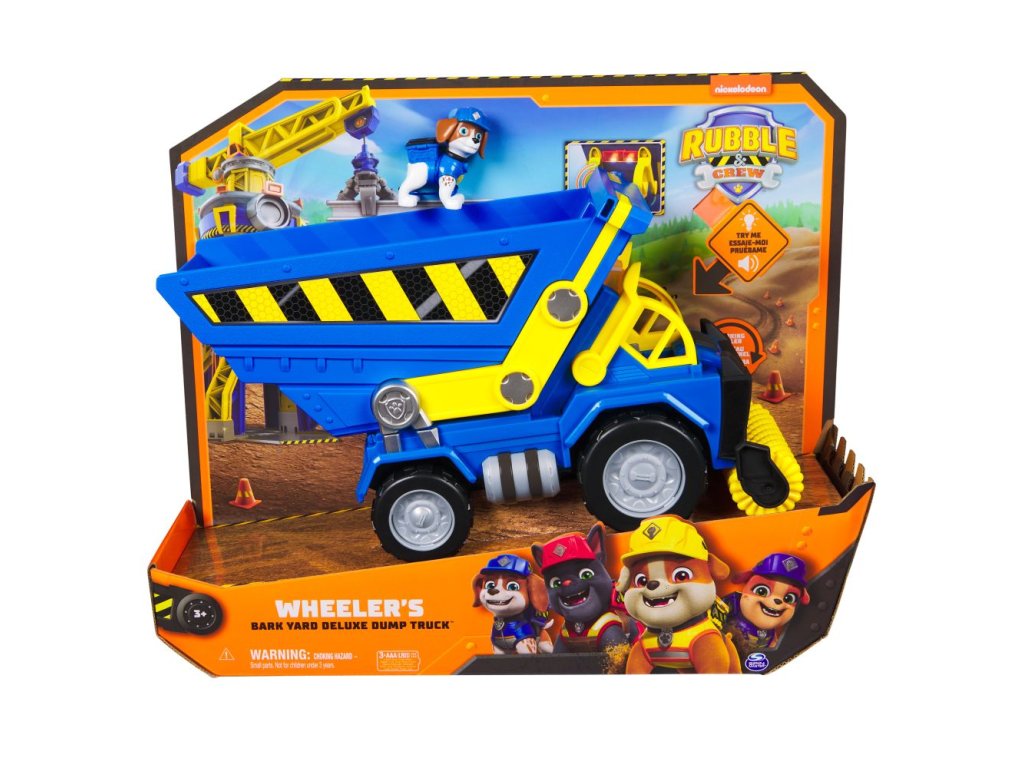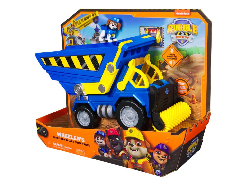 Rozšiřte svůj svět Tlapkové patroly o své oblíbené štěně Wheelera v jeho obřím Náklaďáku se sklápěčkou Bark Yard Deluxe ze seriálu Rubble a jeho parta! Jedná se o obrovskou hračku, která obsahuje opravdová funkční kola, kloubové nástroje, světla a zvukové efekty! Tato sada vozidel obsahuje 5 cm vysokou akční figurku Wheelera oblečeného v oficiální uniformě Rubbla a jeho party! Když přijde čas dát se do práce, posaďte Wheelera na sedadlo řidiče a zatlačte, čímž spustíte působivé světelné efekty a zvuky ze seriálu! Naložte náklaďák se sklápěčkou materiálem, poté naklopte korbu, abyste vysypali její obsah, a nakonec srovnejte hlínu pomocí válce, stejně jako to dělá Wheeler v seriálu! Ještě více zábavy ze světa Rubbla a jeho party vám zajistí stavební náklaďák, plyšové hračky, figurky, sady s kinetickým pískem Build-it nebo sada s Jeřábem Bark Yard spolu se sadou Rubblova dílna, které vám umožní vybudovat vlastní staveniště přímo u vás doma (prodávají se zvlášť)! Pokud hledáte hračku pro předškoláka ve věku 2–4 roky, hračky Rubble a jeho parta pro děti od 3 let jsou to pravé! Přeneste zábavu ze seriálu Rubble a jeho parta domů díky Wheelerovi a jeho Náklaďáku se sklápěčkou Bark Yard!