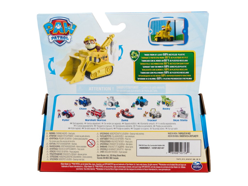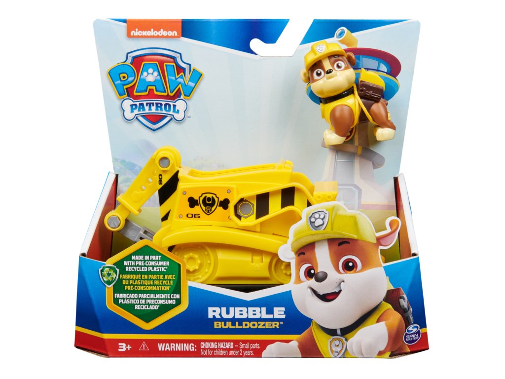 Tlapková patrola vyráží do akce ve svých záchranných vozidlech! Přidejte se k Rubblovi na akčních misích se jeho buldozerem! Když dojde k potížím, umístěte Rubble (včetně figurky) na sedadlo řidiče a vyrazte na s opravdovými funkčními pásy a pohyblivou vrtačkou a lopatou! S autentickými detaily a realistickými prvky, milovaný stavbařský expert Tlapkové patroly a jeho vozidlo přináší úžasnou Tlapkovou patrolu k životu. Rubble a jeho vozidlo jsou ekologicky vyrobené a jsou minimálně z 68 % z recyklovaného plastu! Spojte se s ostatními tlapkami a jejich záchrannými vozidly (prodávána jednotlivě) a pomozte zachránit den v Adventure Bay! Pro ještě zábavnější a napínavější mise inspirované seriálem Tlapková patrola posbírejte všechny hračky Tlapkové patroly ve filmu, jako například úžasné velitelství letadlové lodi a všechny speciální edice hraček, figurek, hracích sad Tlapkové patroly pro dívky a chlapce: Mocné Tlapky, Vodní tlapky a velká vozidla (každé se prodává zvlášť) Užijte si nekonečné Tlapkózní dobrodružství se svým oblíbeným štěněcím hrdinou v jejich charakteristickém vozidle!