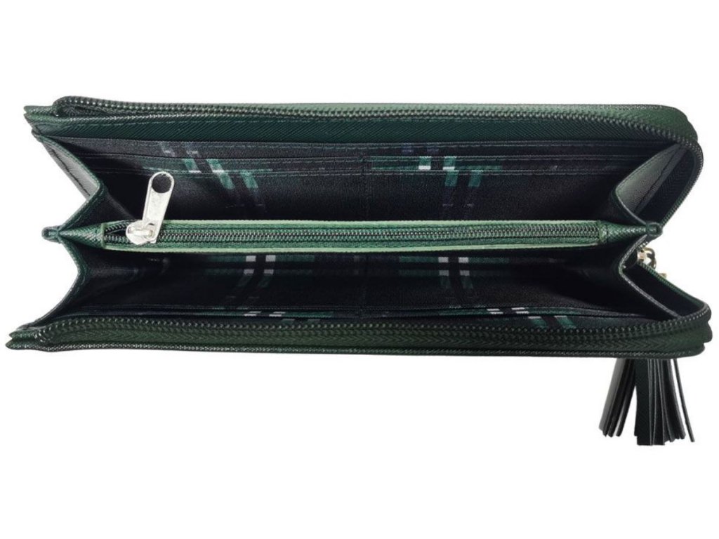 Dámská zelená peněženka inspirovaná bradavickou kolejí Zmijozel. Psaníčko má kostkovanou vnitřní podšívku s potiskem, 12 slotů na karty, střední přihrádka na zip, klenuté cvočky a 2 kapsy.