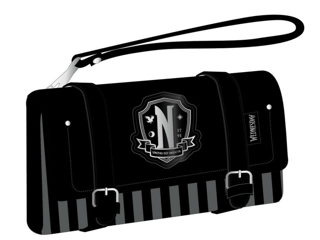 Černá peněženka s grafikou erbu akademie Nikdyvíc (Nevermore Academy). Peněženka má spoustu místa na všechny vaše karty, hotovost i drobné a je na zapínání na 2 přezky.