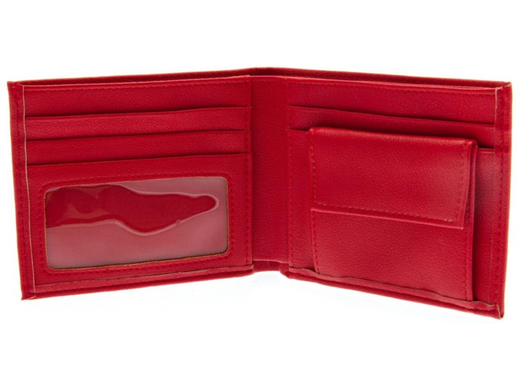 Rozkládací červená peněženka v klubových barvách a se znakem populárního britského klubu FC Liverpool. Pěněženka má kapsičku na mince a přihrádky na karty.