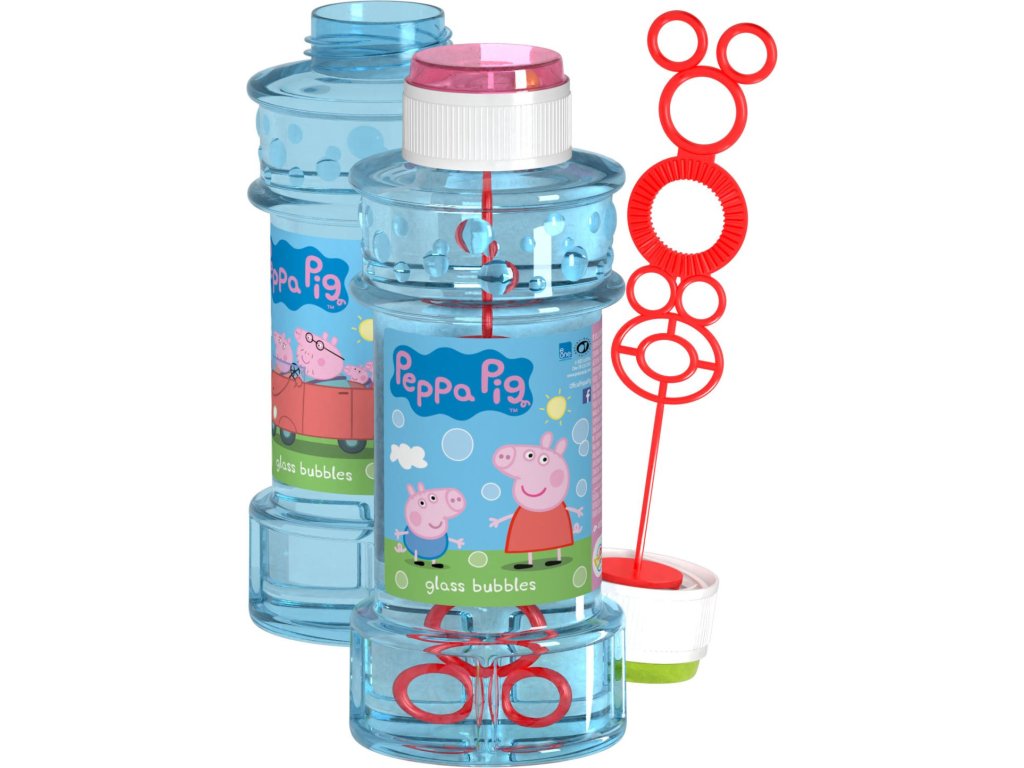 Bublifuk s motivem Peppa Pig o objemu 300 ml. Součástí barevného víčka je hra a foukátko.