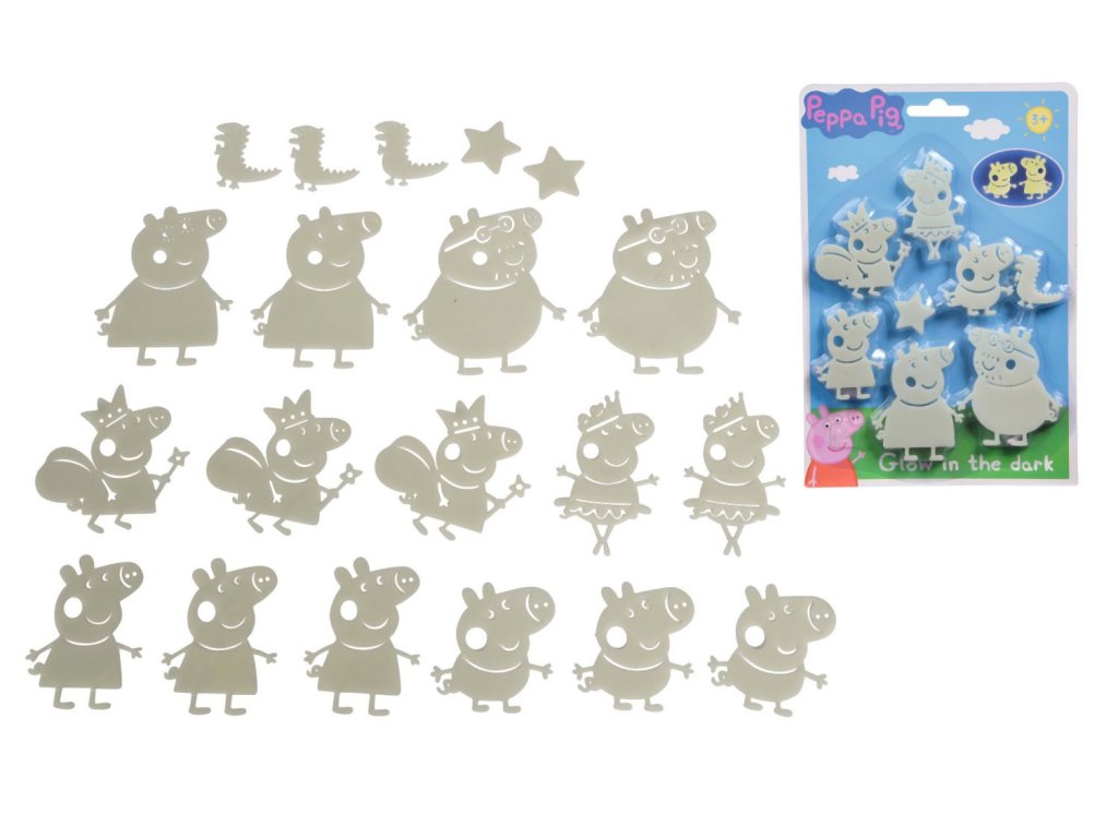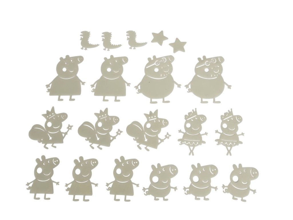 Sada figurek ze seriálu Peppa Pig a dalších obrázků, které po nasvícení ve tmě zpříjemňují usínání menším i větším dětem. Možno nalepit na stěnu, strop, nábytek apod. Obsahuje 20 ks.