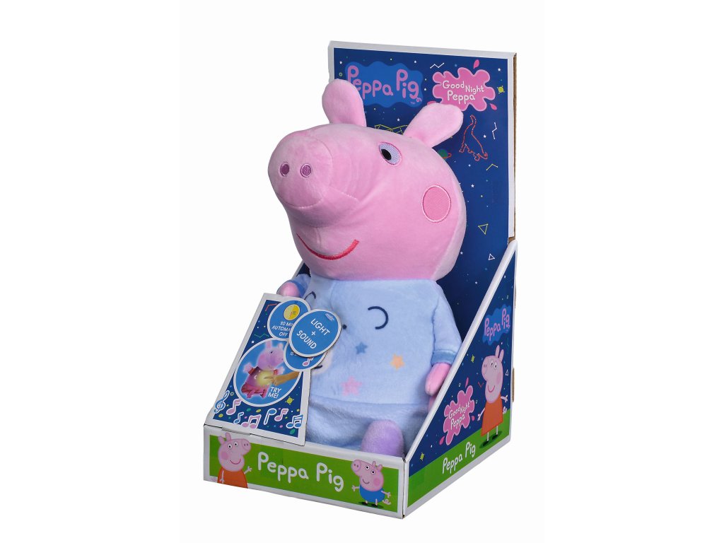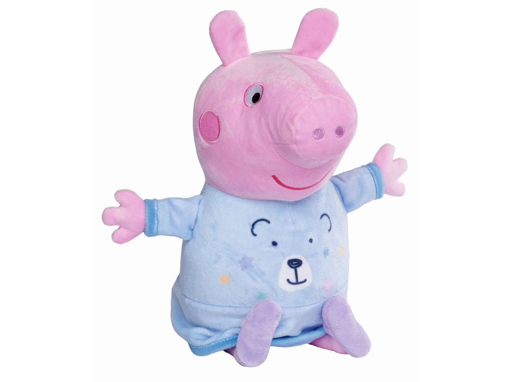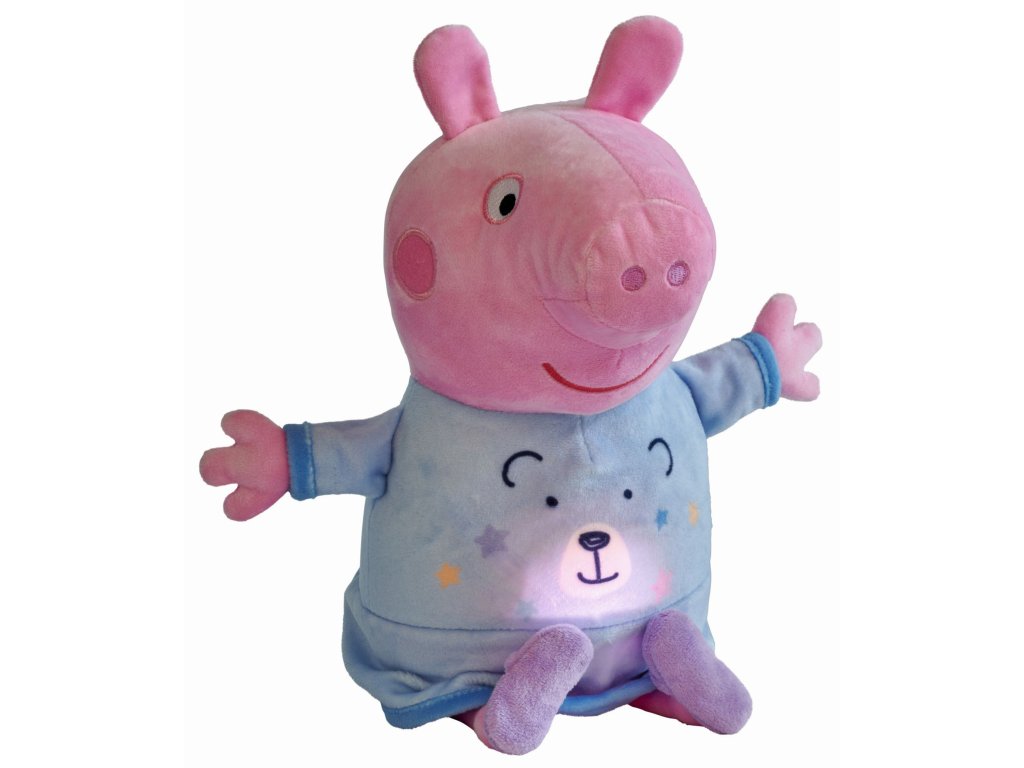Oblíbené prasátko Peppa v roztomilém modrém pyžamku hraje ukolébavku a svítí příjemným nočním světýlkem. Automatické vypínání. Skladba má délku 15 minut, světlo svítí 30 minut. Poté se vše opět automaticky vypne. Výška 25 cm.