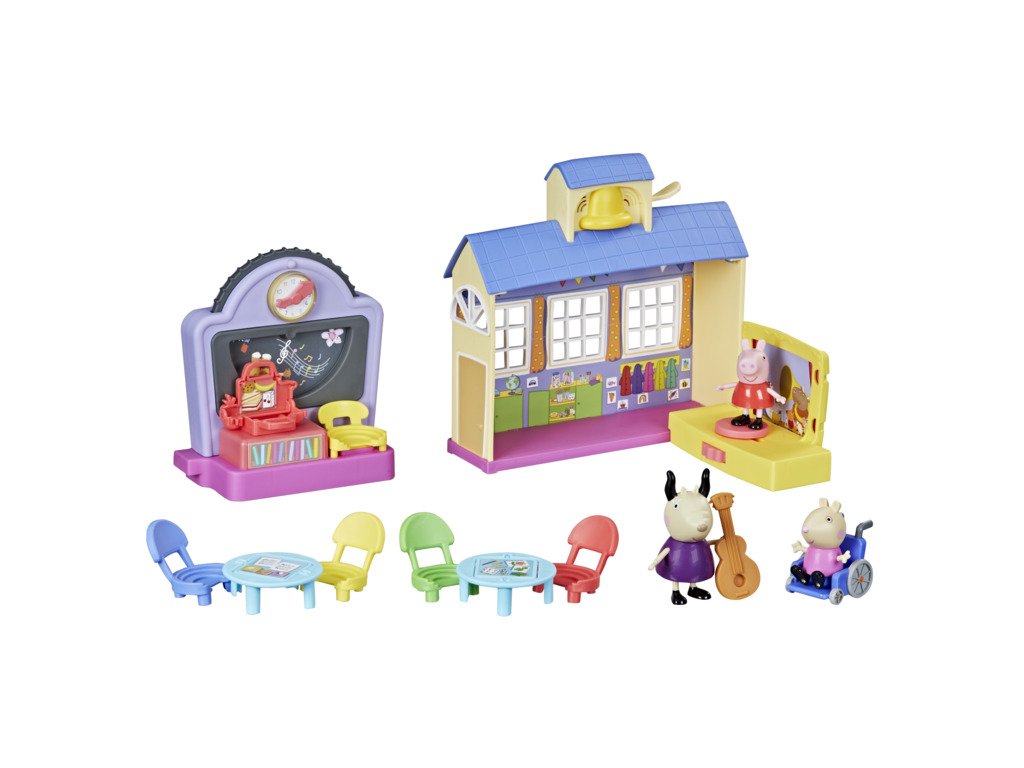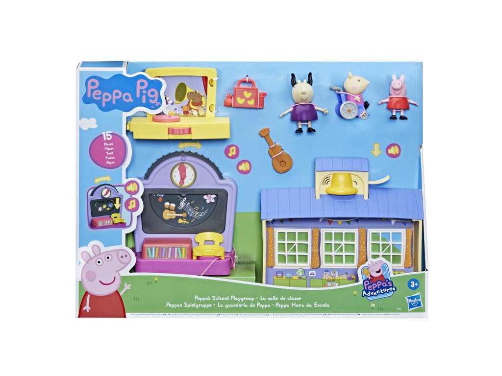 V této nové herní sadě si děti užijí předměty hudební a výtvarné výchovy, vyprávění příběhů a mnoho dalšího v Peppině školní třídě doprovázené povídáním madam Gazely a dalšími zvuky, které znáte ze seriálu. Poslechněte si vyprávění dne otočením knoflíku hodin a sledujte, jak se mění nápisy na tabuli! Herní sada obsahuje dvě 8cm figurky a více než 5 doplňků, včetně 2 s jedinečnými vlastnostmi.