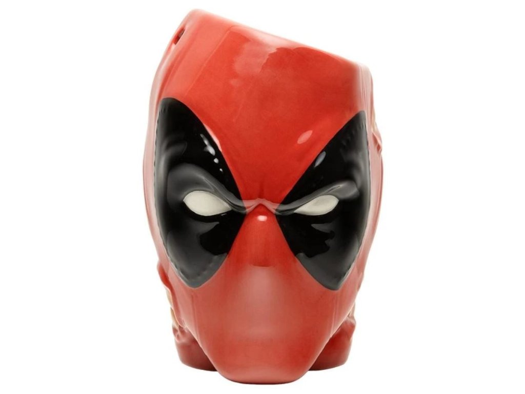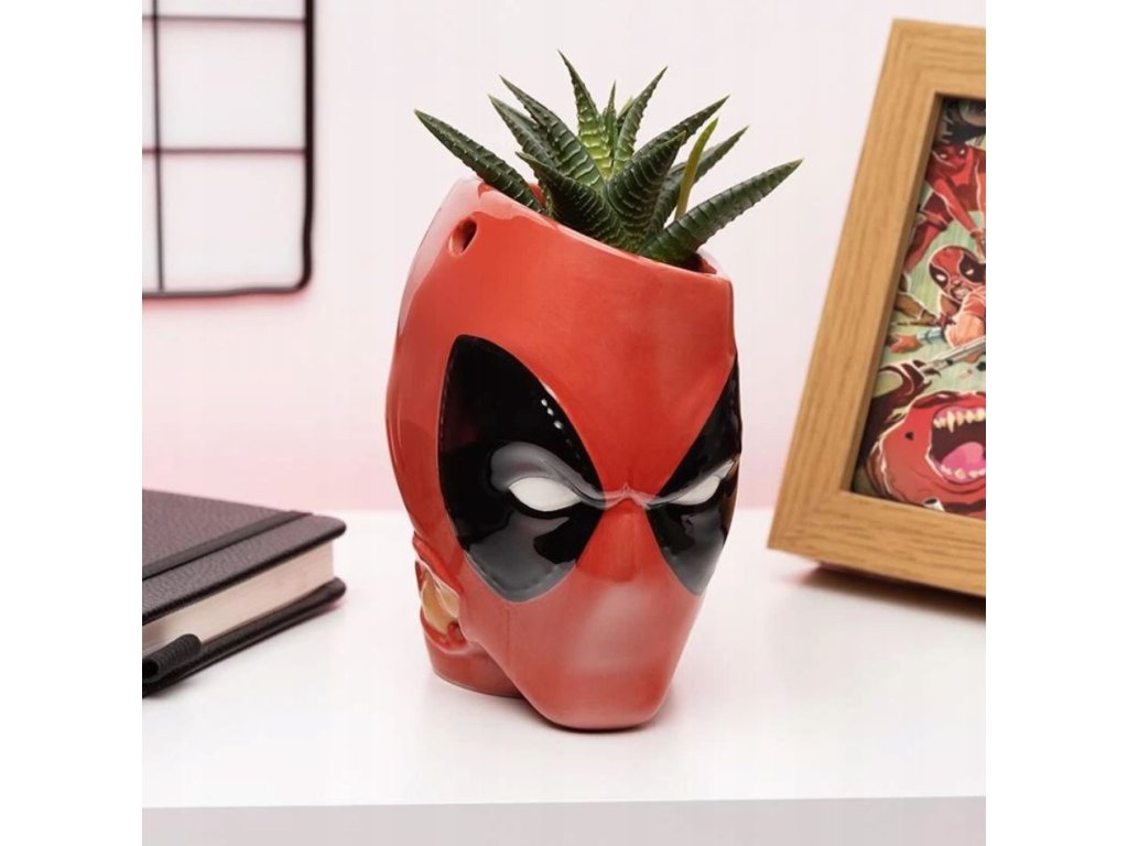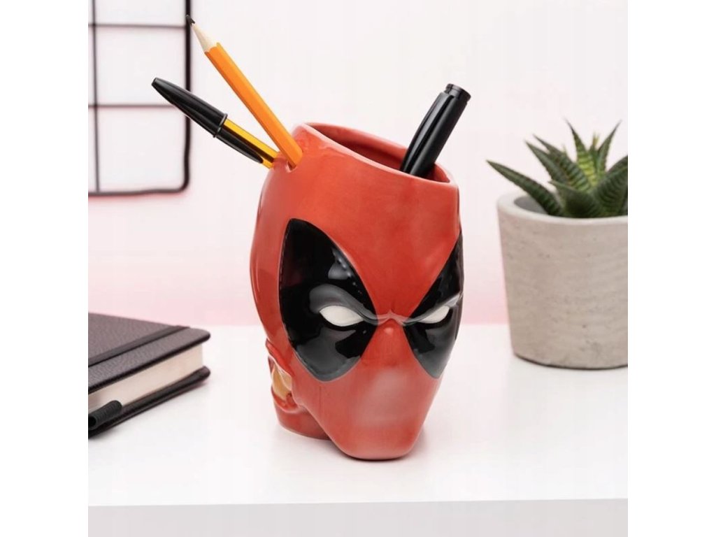 Keramický červený stojánek na psací potřeby vyvedený v grafice masky Deadpoola. Stojánek je vhodný nejen pro všechny vaše psací potřeby, ale můžete si do něj umístit například menší kytičku, jako je kaktus. Stojánek pro všechny menší i větší fanoušky, kteří chtějí své propisky mít organizované ve stylu.