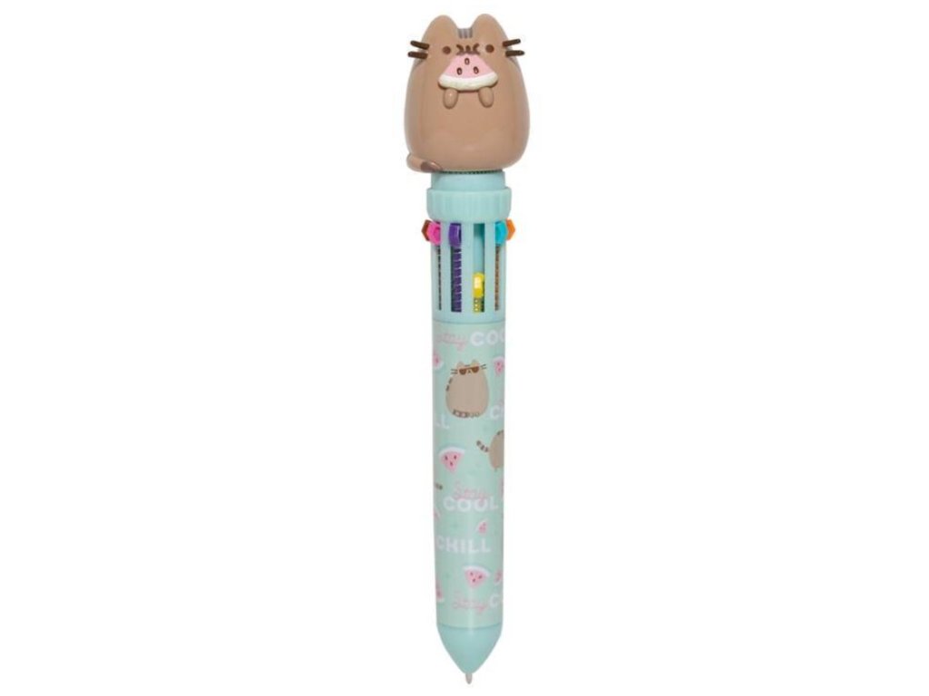 Zelená plastová propiska s vícebarevnou tuží inspirována kreslenou kočkou Pusheen. 10barevné pero s 3D topperem.