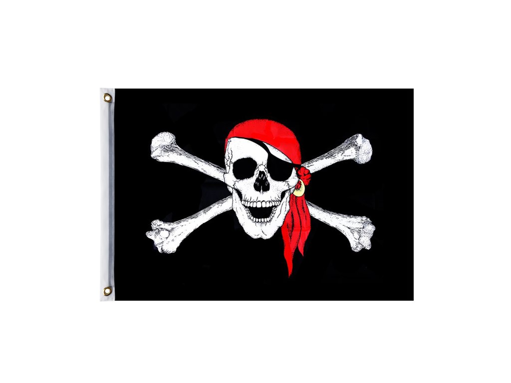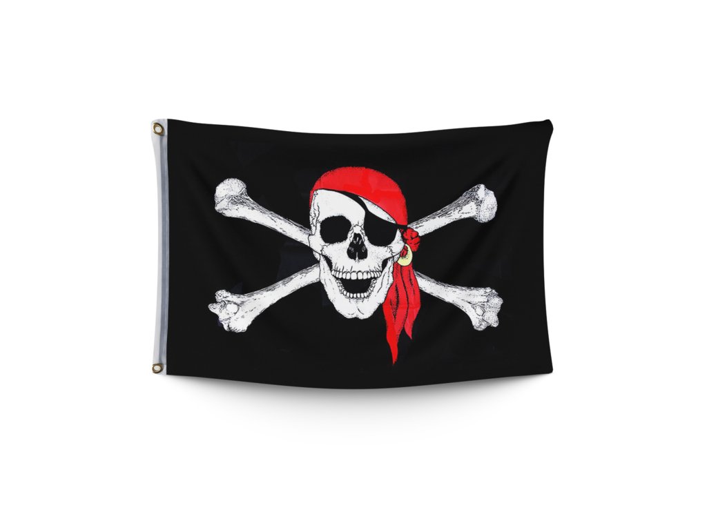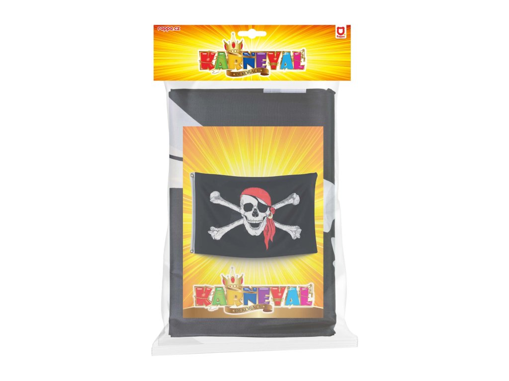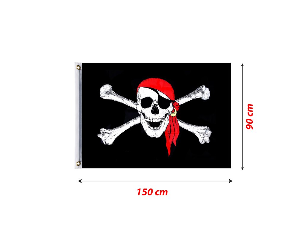 Parádní vlajka s děsivým, pirátským motivem pro skutečné piráty! Na vlajce najdeš i na koncích stužky, které slouží pro uchycení a také díru na tyč. Rozměry vlajky činí 90 x 150 cm. Paráda!