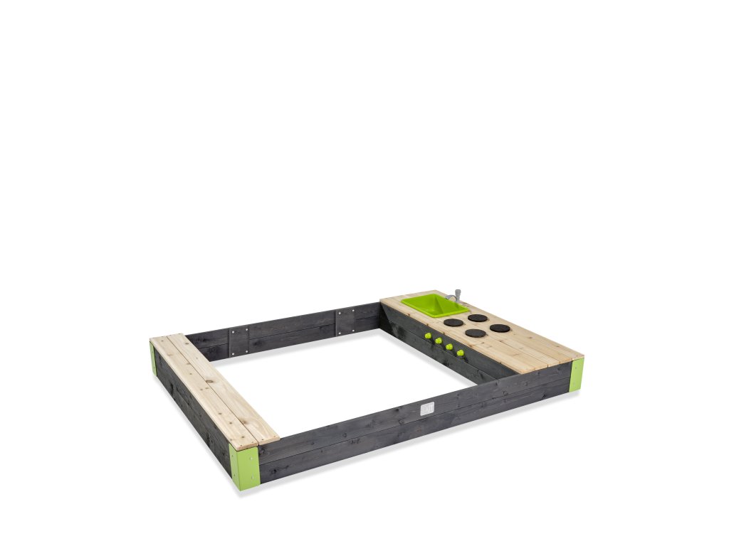 Pískoviště Exit 200 x 140 s kuchyňkou napojenou na vodu zaručí mnoho zábavy. Vodu jednoduše napojíte na hadici pomocí rychlospojky. Úložný prostor poskytne místo pro kuchyňské doplňky, nebo jiné hračky. Dětská kuchyňská deska má sporák s otočnými knoflíky a umyvadlo se skutečně fungujícím kohoutkem na vodu. Kuchyňský "dřez" můžete lehce vyjmout a snadno z něj odstranit vodu.