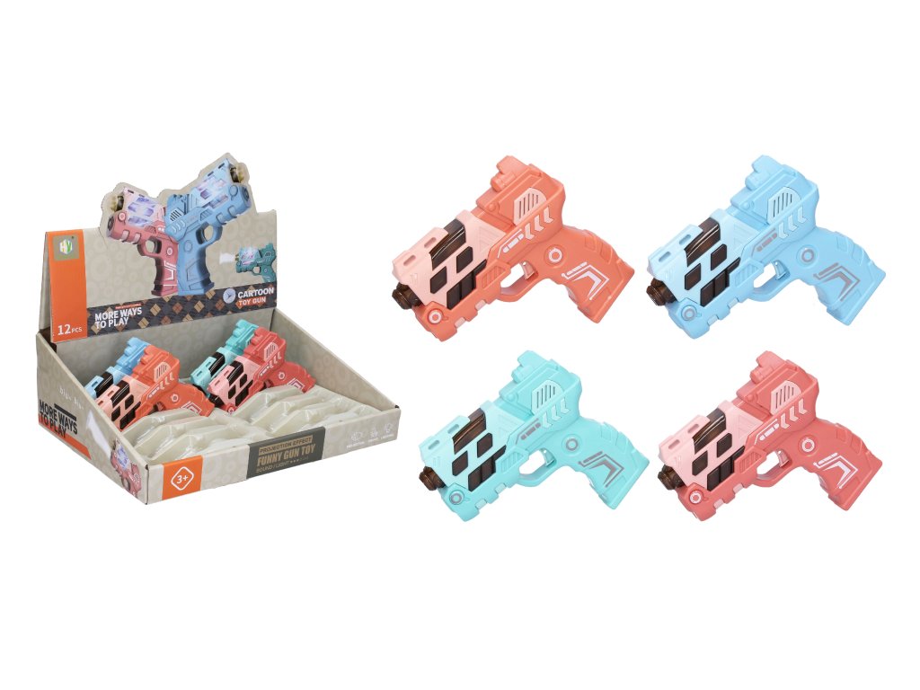 Pistole s efekty. Velikost 12 cm. Světelné a zvukové efekty, projekce obrázku. 2xAAA baterie nejsou součástí. 12 ks display box. 4 varianty - modrá, zelená, oranžová, růžová.