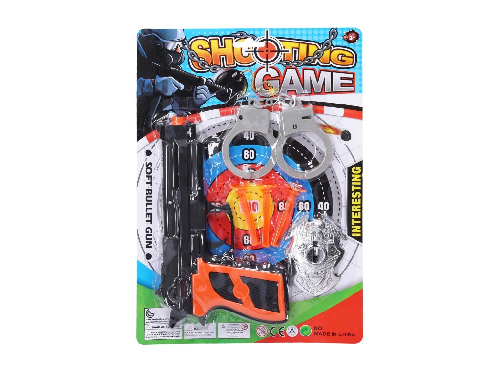 Policejní set. Velikost pistole 20,5 cm. Obsahuje pistoli, 3 náboje, odznak, pouta.