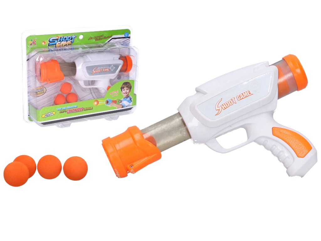 Puška pumpující s pěnovými míčky. Rozměry 23x6x14,5 cm.