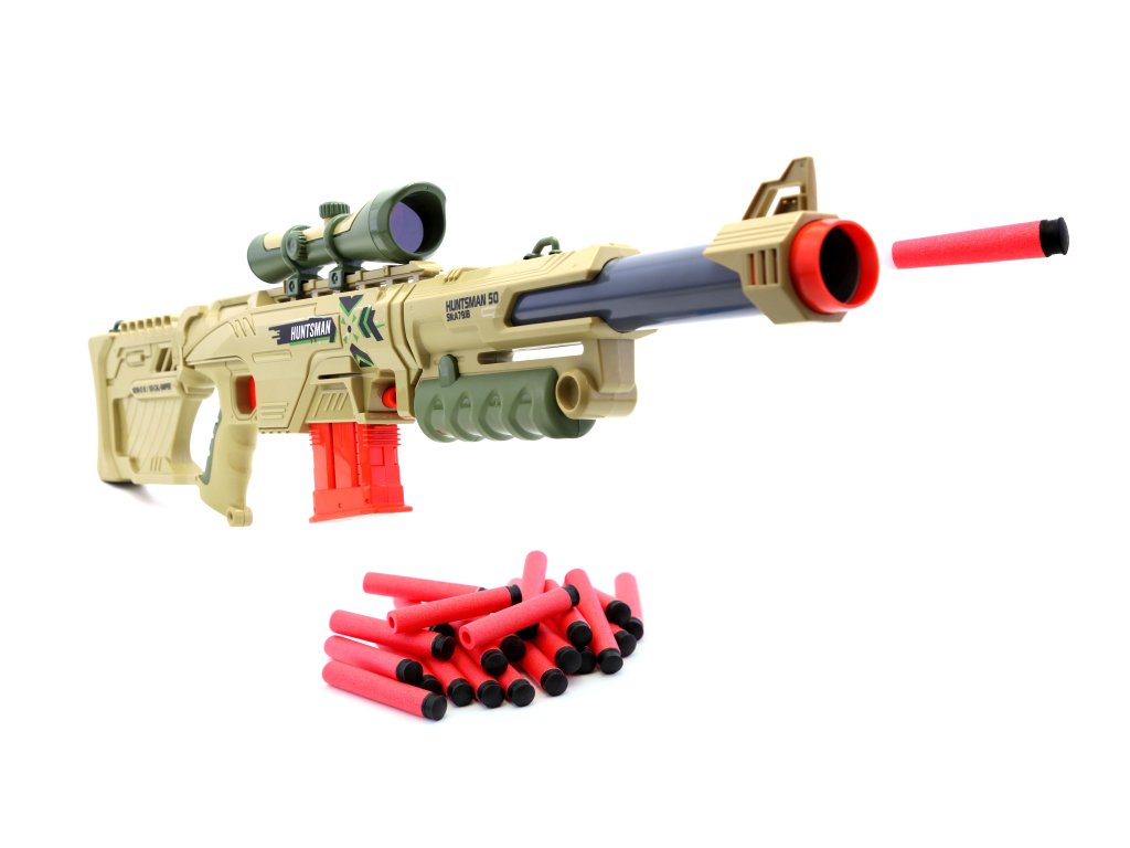 Největší zbraň kolekce Huntsman - Sniper Blaster umožňuje snadno sejmout prodloužení hlavně, pažbu i zaměřovač a proměnit tak tohoto skvěle vypadajícího dalekonosného obra na šikovnou ruční zbraň na pěnové náboje.