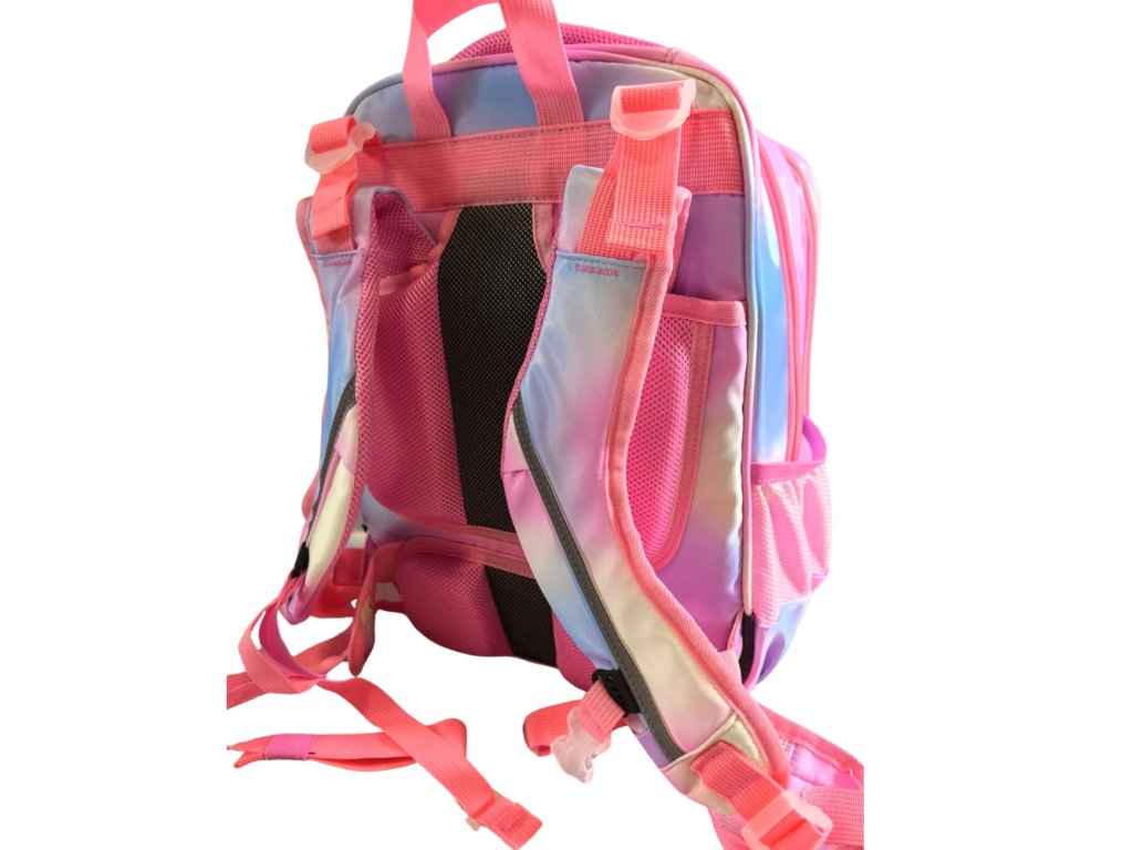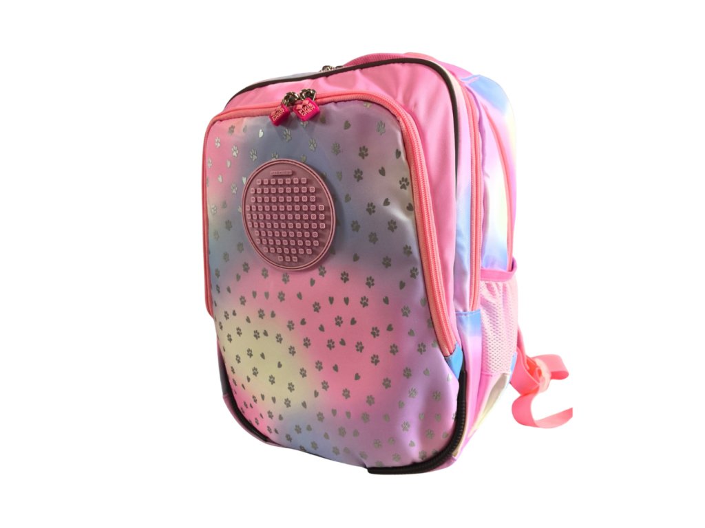 Školní batoh je vhodný od 3. třídy ZŠ, pro děti od výšky 130 cm. Batoh je vyroben z voděodolného polyesterového materiálu a silikonu, což umožňuje velice snadnou údržbu. Stačí jen otřít vlhkým hadříkem nebo houbičkou. Batoh má tři samostatně uzavíratelná prostorná oddělení. Kapsa nejblíže u zad je rozměrově největší a vejdou se do ní sešity, či jiné předměty o velikosti A4. Dvě velká oddělení jsou vhodná na knihy, sešity a jiné dokumenty menšího formátu. Po obou stranách batohu jsou síťovinové kapsy, do kterých lze umístit láhev. Pro komfortní užívání má batoh ergonomicky tvarovaná polstrovaná záda s ventilací a posuvný zádový systém umožňující nastavení optimální polohu popruhů vzhledem k výšce dítěte. Popruhy jsou široké a polstrované, aby se nezařezávaly a v přední části mají délkově nastavitelnou hrudní přezku, aby dětem nepadaly z ramen. Pro pohodlné přenášení v ruce je batoh vybaven polstrovaným úchytem, které také může sloužit pro zavěšení. Na přední straně batohu je umístěn unikátní silikonový PIXIE CREW creative panel TM růžové barvy. Kruh je o průměru 9 cm a k dispozici máte 86 bodů pro nekonečné množství motivů na každý den díky PIXIES (pixelům), které můžete kdykoli sundat a vyměnit za jiné. Ke každému batohu zdarma přikládáme balíček přibližně 50 ks malých PIXIES (pixelů). Rozměry balení: 40 x 42 x 33 cm. Rozměr produktu: 44 x 34 x 14 cm. Věk: 8+
