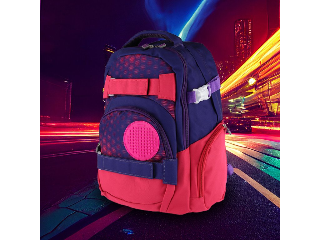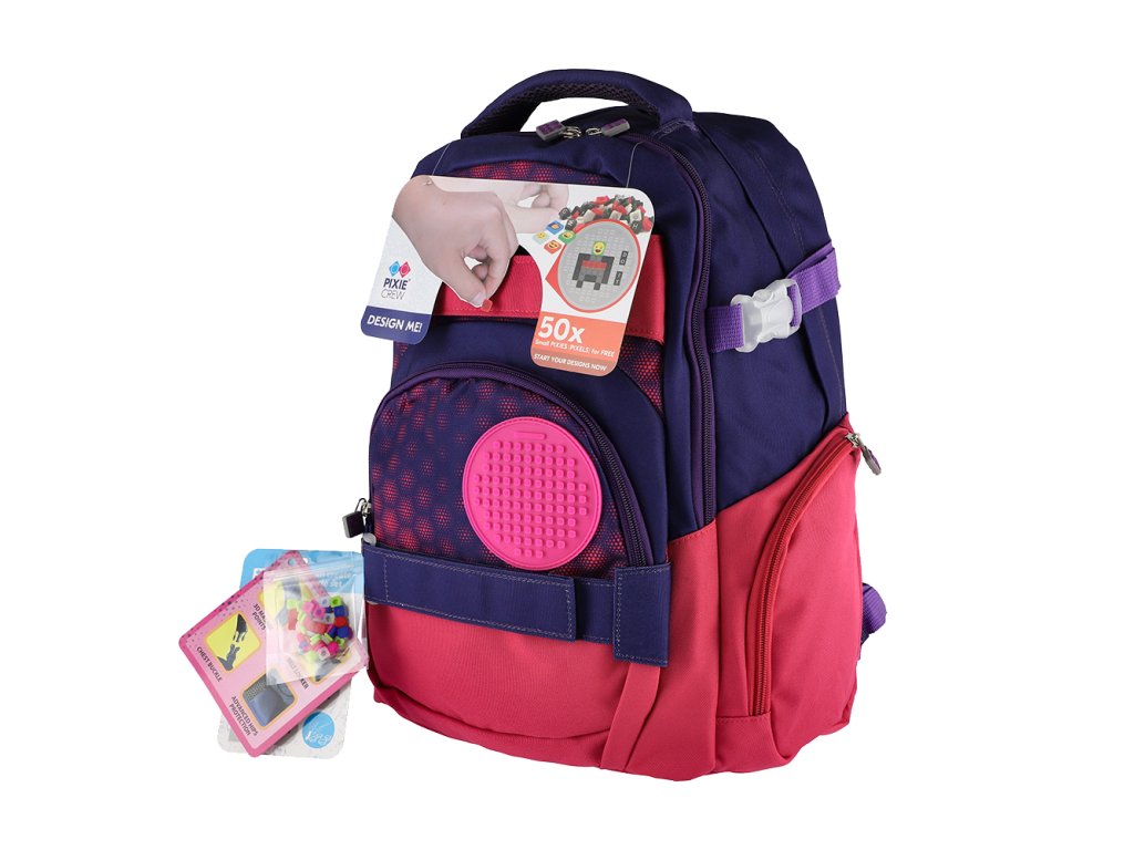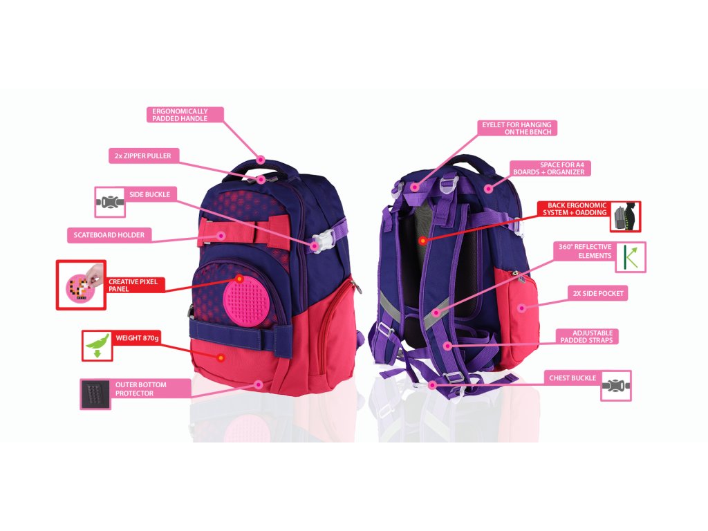Školní batoh v designu Hexee je vhodný od 4. třídy ZŠ, pro děti od výšky 140 cm. Batoh je vyroben z voděodolného polyesterového materiálu a silikonu což umožňuje velice snadnou údržbu. Stačí jen otřít vlhkým hadříkem nebo houbičkou. Batoh má tři samostatně uzavíratelná prostorná oddělení. V hlavní kapse, která se nachází nejblíže zádům, se nachází polstrovaná kapsa sloužící na notebook do velikosti 15”, tato kapsa je uzavíratelná suchým zipem. Velké oddělení je vhodné pro knihy, sešity a jiné dokumenty formátu A4. V prostředním oddělení je menší organizér na drobné věci a denní potřeby. Do tohoto oddělení se vejdou sešity o velikosti A4. Přední kapsa je formátu A5. Po obou stranách batohu jsou malé kapsy uzavíratelné zipem. Do těchto kapes lze umístit láhev a nebo jakékoliv jiné drobnosti, které chcete mít po ruce. Pro komfortní užívání má batoh ergonomicky tvarovaná polstrovaná záda a posuvný zádový systém umožňující nastavení optimální polohu popruhů vzhledem k výšce dítěte. Popruhy jsou široké a polstrované, aby se nezařezávaly. V přední části mají délkově nastavitelnou hrudní přezku, aby dětem nepadaly z ramen. V dolní části je bederní přezka, která pomáhá batoh odlehčit v případě, že je moc těžký. Pro pohodlné přenášení v ruce je batoh vybaven polstrovaným úchytem, pro zavěšení slouží pevné poutko. Na přední kapse je umístěn unikátní kruhový silikonový PIXIE CREW creative panel™ růžové barvy. Máte k dispozici 86 pozic pro nekonečné množství motivů na každý den díky PIXIES (pixelům), které můžete kdykoliv sundat a vyměnit za jiné. Ke každému batohu zdarma přikládáme balíček 50 malých PIXIES (pixelů) a mini galerii pro inspiraci. Tu můžete také čerpat na stránkách pixiecrewgallery. Rozměr: 44x34x14 cm. Věk 6+