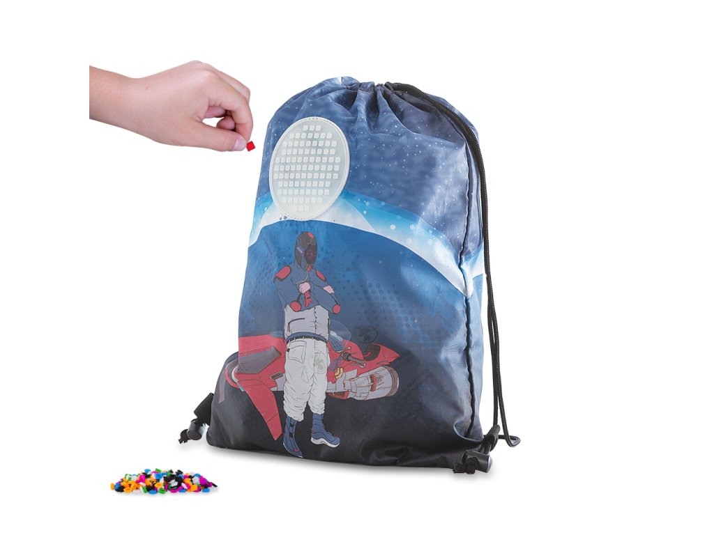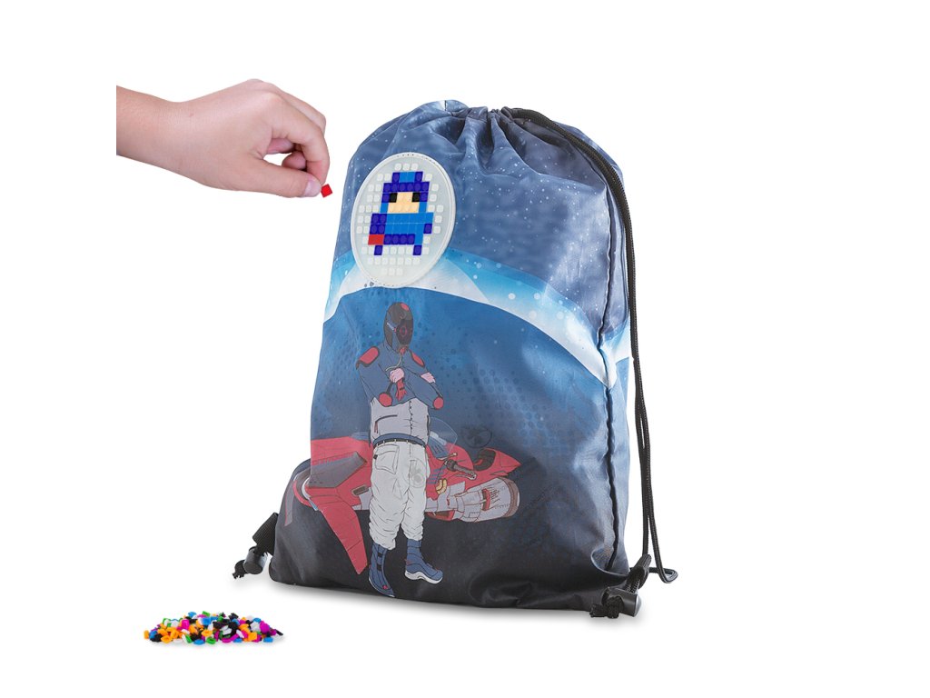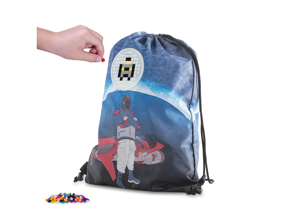 Praktický a univerzální vak na záda od PIXIE CREW s rakeťákem Derekem je ideálním doplňkem k aktovce nebo jako samostatný pomocník pro volnočasové aktivity. Jeho hlavní prostor uzavíratelný šňurkovými popruhy poskytuje dostatek místa pro uložení různých drobností, ať už jsou to sportovní potřeby, svačina nebo školní pomůcky. Vnitřní kapsa na drobnosti je praktická pro uchování menších předmětů jako jsou klíče nebo peníze. Praktický je také i díky použitému materiálu, který je jednoduchý na údržbu a je lehce složitelný a skladný. Sáček je lehký a snadno se nosí, a zároveň nabízí možnost personalizace pomocí pixelů, což umožňuje dětem vyjádřit svůj osobní styl. Na přední straně je umístěn unikátní silikonový PIXIE CREW creative panel TM svítící ve tmě. Kruh je o průměru 9 cm a k dispozici máte 86 bodů pro nekonečné množství motivů na každý den díky PIXIES (pixelům), které můžete kdykoli sundat a vyměnit za jiné. K vaku zdarma přikládáme balíček přibližně 55 ks malých PIXIES (pixelů), 10 malých PIXIES (pixelů) s písmeny, 4 multipixely (pixel o vel. 2x2 body) s obrázky a mini galerii pro inspiraci. Inspiraci můžete také čerpat na stránkách pixiecrewgallery. Rozměr: 32x43x1. Věk 6+