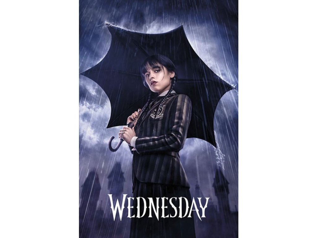 Plakát s grafikou hlavního snímku, postavy Wednesday Addamsové z Addamsovy rodiny s deštníkem z populárního seriálu Wednesday. Plakát je vhodný do všech možných prostorů vašeho bytu, pro všechny menší i větší fanoušky tohohle seriálu.