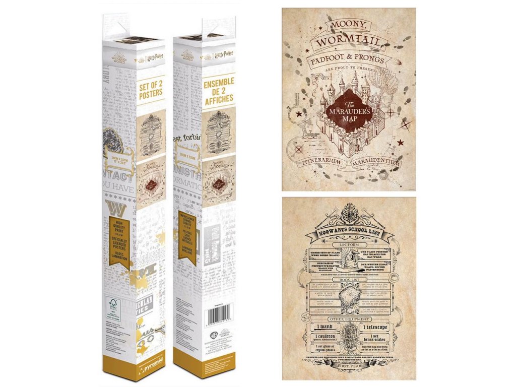 Set 2 vysoce kvalitně potištěných plakátů s grafikou školního seznamu potřebných věcí a Pobertova plánku ze ságy Harryho Pottera. Plakáty se skvěle hodí všem fanouškům do svých pokojů.