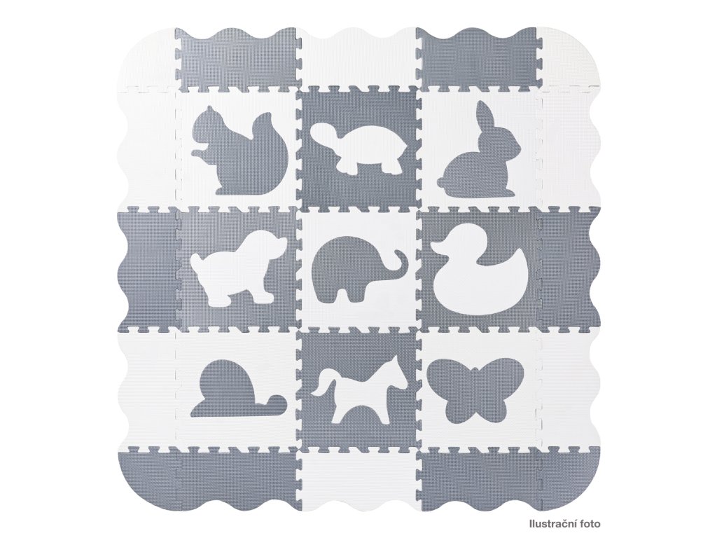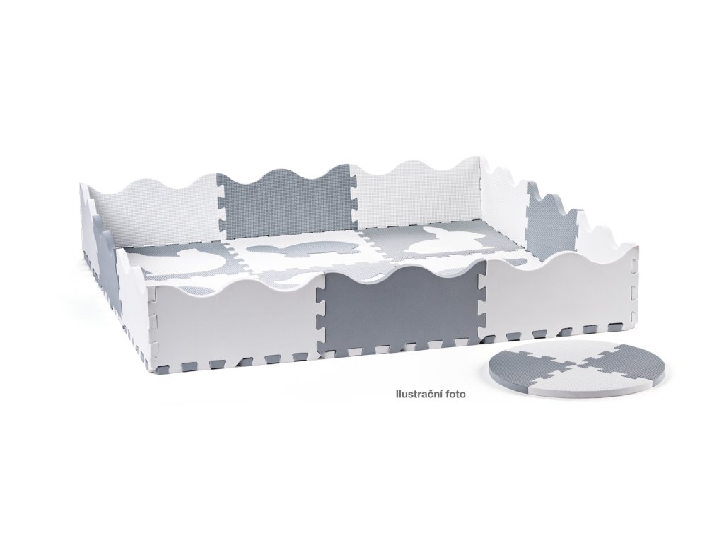 Pěnové díly s puzzle zvířátky slouží jako hračka i jako podložka na hraní a odpočinek. Boční díly se dají sestavit tak, že vytvoři ohrádku pro nejmenší děti. Barva výrobku je ilustrativní a přesný vzhled se může lišit (barevná kombinace bílá/šedá). Rozměr: 121 x 121 cm. Výška pěnového dílu: 1,3 cm. Věk: 3+