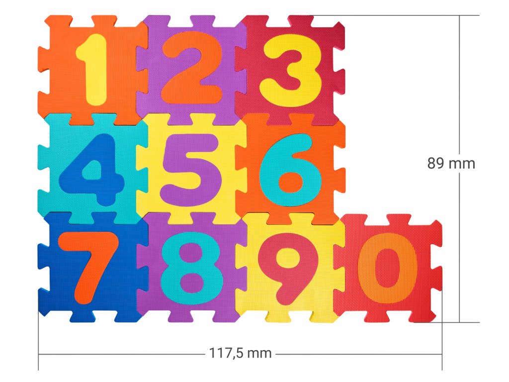 Pěnové puzzle s vyjímatelným středem seznámí děti s různými čísly. Jednotlivé pěnové díly jsou vyrobeny v různých barvách a s číslicemi 0-9. Lze je snadno sestavit a použít nejen jako stavebnici, ale také jako podložku na zem . Jsou netoxické, bezpečné a omyvatelné. Tato hračka rozvíjí manuální zručnost a podporuje fantazii dítěte. Velikostně ideální pro malé ručičky. Počet dílů: 26. Rozměr: 32 x 32cm. Věk: 3+