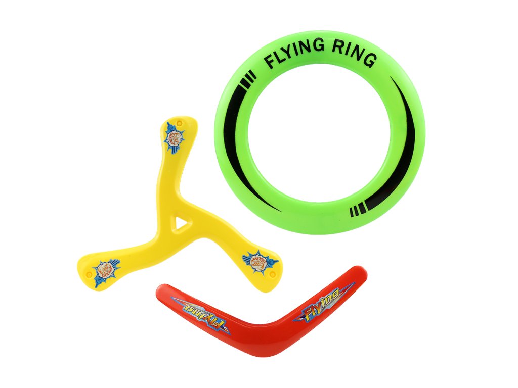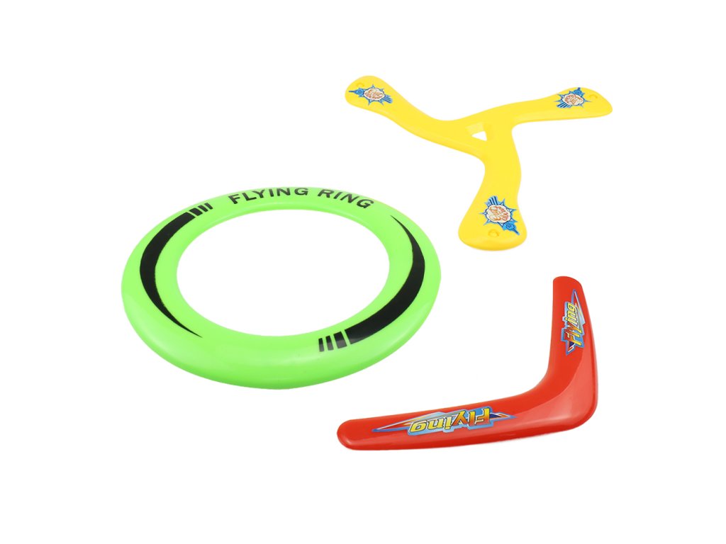 Užijte si zábavu v parku, na pláži či na zahradě s touto sadou 3 létajících disků. Sada obsahuje 3 zcela odlišné frisbee. Létající kruh, bumerang a trojitý bumerang pro ještě větší zábavu. Každý létající disk je v jiné jasné barvě. Rozměry frisbee: létající kruh O 25 cm, bumerang 30 cm, trojitý bumerang 28 cm. Rozměr balení: 33,5 x 28 x 3 cm. Věk: 3+