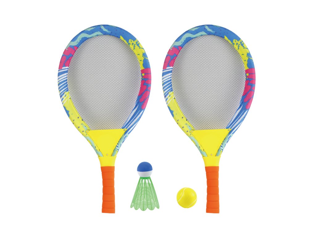 Krásně barevná dětská sada na venkovní hry – tenis nebo badminton. Rakety mají měkké pěnové rukojeti, které dobře padnou do dětských rukou a pohodlně se drží. Extra měkká síťka výpletu v porovnání s klasickými raketami usnadňuje odpal. Sada obsahuje 2 rakety, jeden měkký plastový míček, jeden badmintonový košík. Míčky jsou lehké, což zaručuje maximální bezpečnost během hraní. Sada je vhodná pro děti od 3 let. Rozměry rakety: 55 x 28 x 2 cm. Rozměry košíku: 14 x 11 cm. Rozměr míčku: O 6 cm