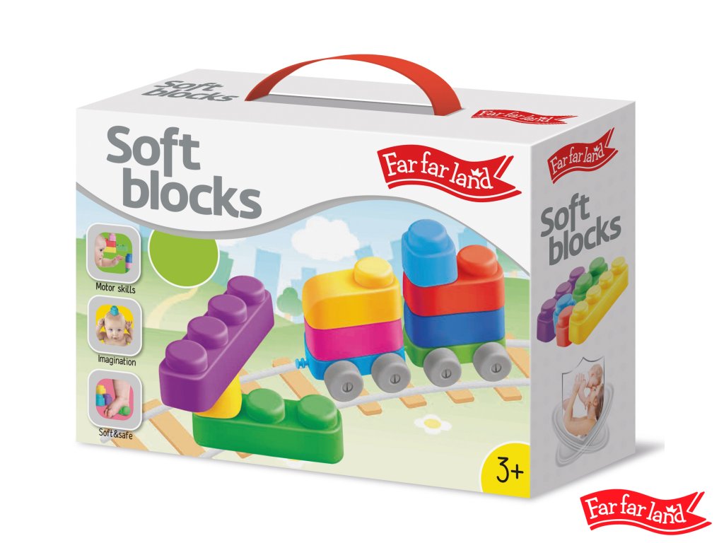 Far Far Land Stavebnice měkká. Balení obsahuje 10 dílků stavebnice a 8 koleček. Všechny bloky jsou vyrobeny s měkkého bezpečného materiálu.