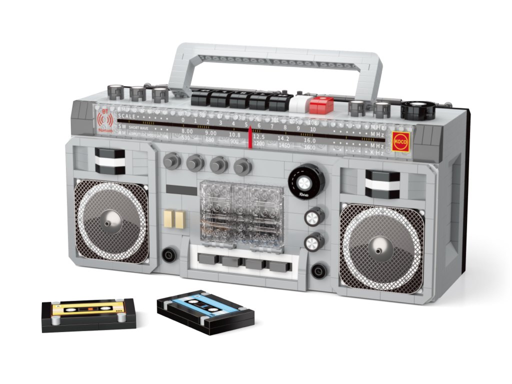 KOCO Stavebnice Kazetový přehrávač 1982 dílků. Rozměry 18,5x7,5x14,5 cm. Součástí 2 figurky. Obrázkový návod na sestavení součástí.