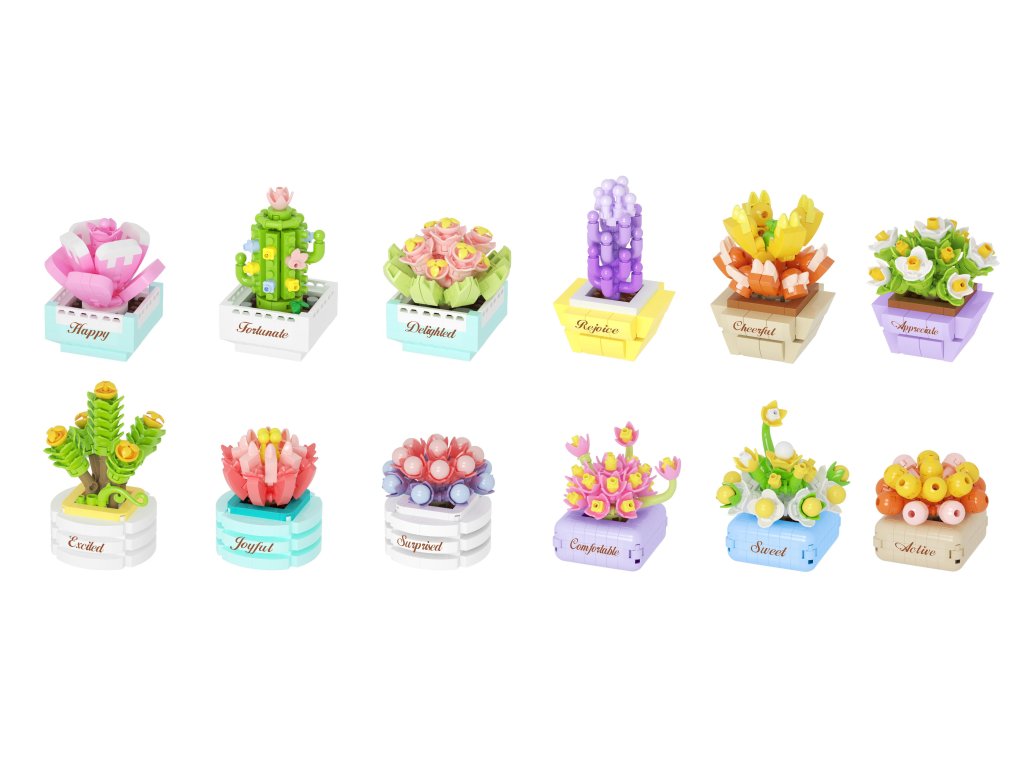 KOCO stavebnice mini rostliny. 12 různých ks v display boxu. Obsahuje kostičky, nástroj na oddělení kostiček, podrobný obrázkový návod na složení.