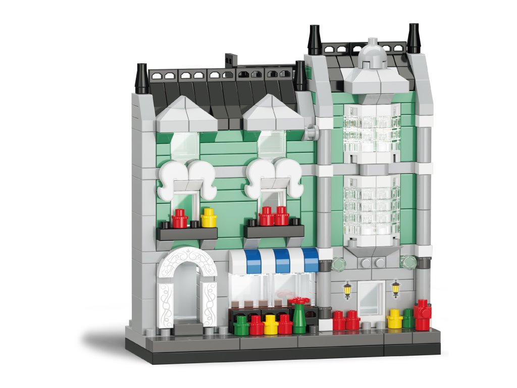 KOCO Stavebnice Obchod s potravinami 329 dílků. Rozměry 8x3x9 cm. Obrázkový návod na sestavení součástí.