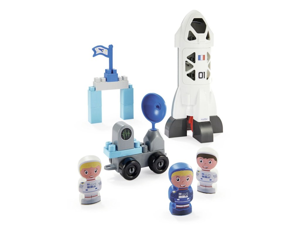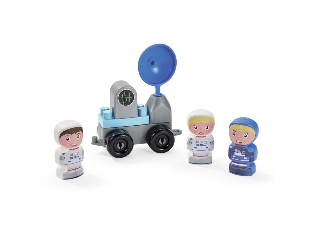 Raketoplán, vesmírné vozítko a 3 astronauti. Rozměry: 13,5 x 13,5 x 28 cm. Věk: 18M+