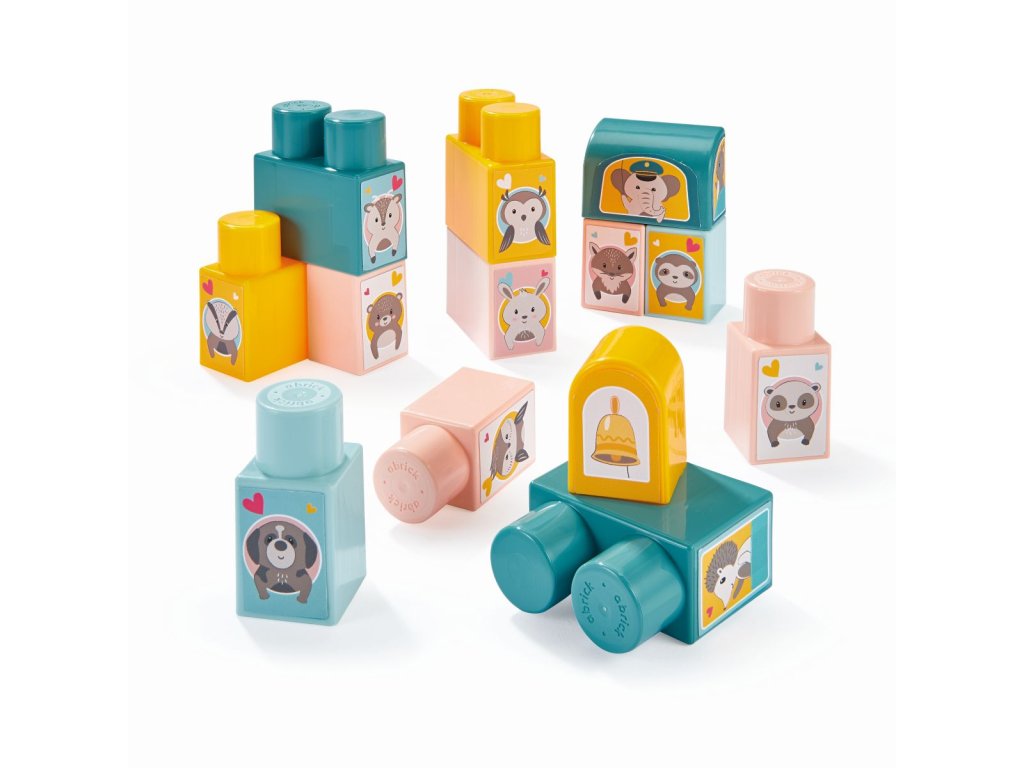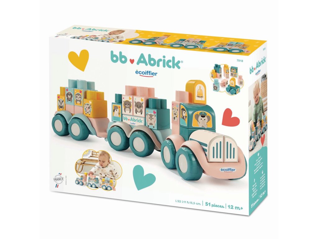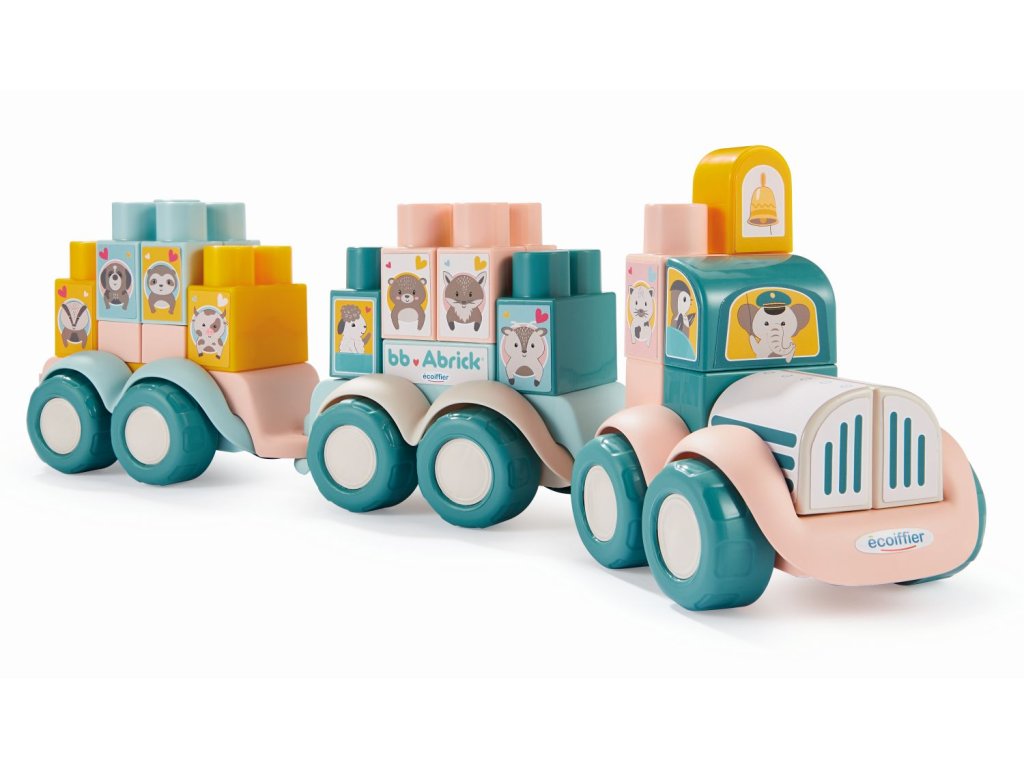 Vláček se zvířátky z řady BB Abrick v pastelových barvách. Obsahuje lokomotivu a 2 vagonky a 30 kostiček. Rozměry vláčku: 52 x 15,5 x 11 cm.