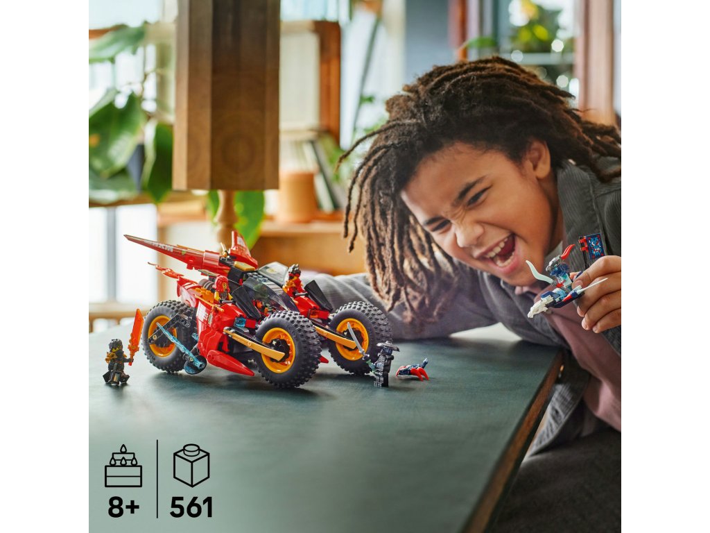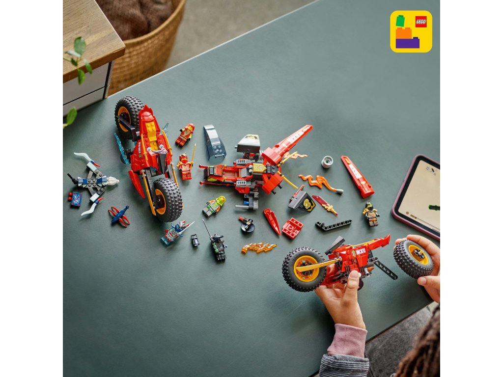 Děti od 8 let si se stavebnicí Bojového vozidla 3 v 1 (71844) připomenou scény z 3. řady televizního seriálu NINJAGO® Dračí povstání. Děti si můžou hrát s velkou akční figurkou nindžovské motorky a pak ji rozdělit na 3 menší vozidla: Kaiovu motorku, Wyldfyreinu motorku a Frakovu stíhačku se 2 vystřelovači. Tato stavebnice LEGO® obsahuje 6 minifigurek: Kaie, Wyldfyre a poprvé i Fraka, z nichž každá má 2 zlaté katany, Colea s průsvitnou odhalující čepelí a Nokta a Přízračného dračího zvěda, z nichž má každý jeden meč, a k tomu navíc model kluzáku a malého tvora. Zlotřilá dvojice má také vlajku s tajnou zprávou, kterou dokáže odhalit pouze Coleova průsvitná odhalující čepel. V dalších stavebnicích z řady LEGO NINJAGO najdete draky, vozidla a chrámy a fanoušci si užijí hodiny zábavného hraní se svými oblíbenými hrdiny. Aplikace LEGO Builder vám a vašemu dítěti ukáže cestu stavitelským dobrodružstvím pro skládání nindžovského modelu. Stavebnice obsahuje 561 dílků.
