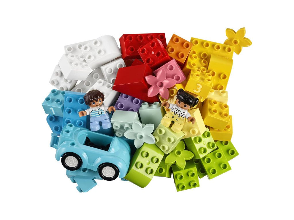 Pevný úložný box ukrývá auto s pohyblivými koly, střechu, okno, květinu, chleba, DUPLO figurky, kostky s čísly 1, 2 a 3, a k tomu navíc spoustu originálních kostek v zajímavých barvách. Zatímco děti budou spojovat kostky a dílky do nespočtu nápaditých her a modelů, rodiče s nimi mohou sdílet radost a jejich důležité vývojové milníky.
