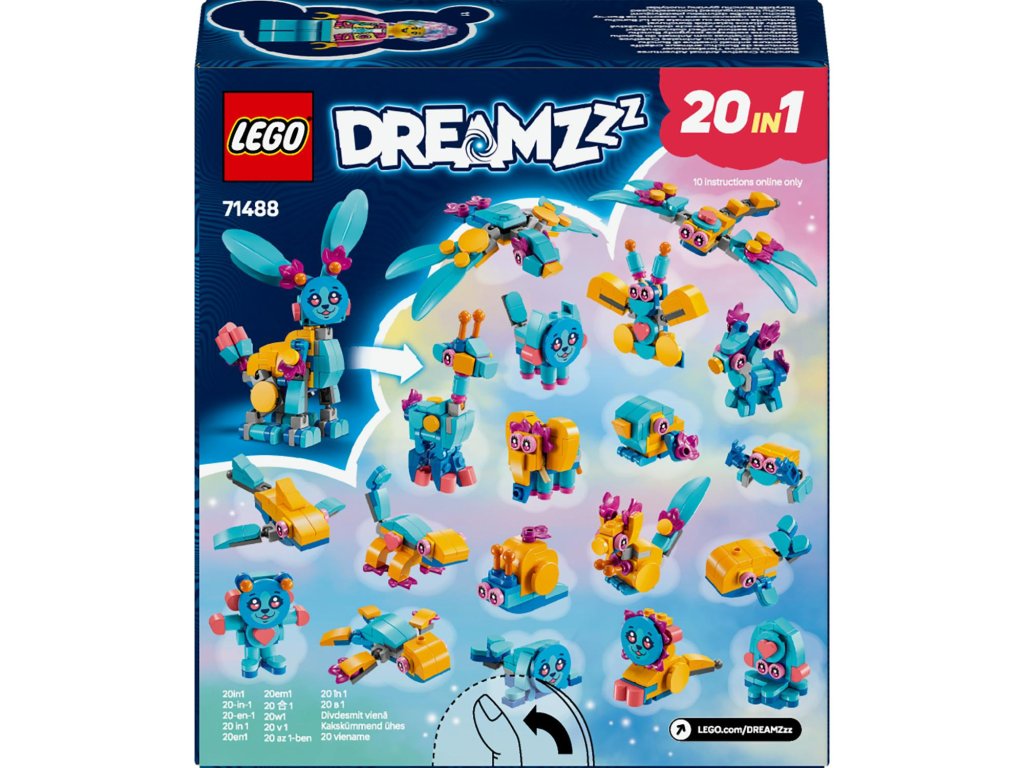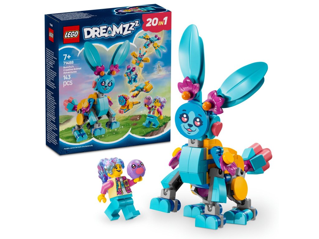Dopřejte dětem tvořivé hraní se stavebnicí LEGO® DREAMZzz™ (71488) Bunchu a kreativní zvířecí dobrodružství pro holky a kluky. Tato úžasná stavebnice s králíčkem je plná herního potenciálu a umožňuje malým snílkům od 7 let objevit 20 krásných způsobů, jak přestavit králíčka Bunchu. Děti si užijí hodiny kreativity při stavění roztomilé figurky králíčka Bunchu s pohyblivýma nohama, rukama, tlapkami, ocasem a ušima, kterou pak přestaví na některý z 19 modelů zvířátek. Mezi tyto možností patří lev, želva, jelen, motýl, vážka a spousta dalších! Tuto fantasy stavebnici se zvířátky oživí minifigurka Izzie v novém oblečení s plyšákem v ruce. Děti se můžou těšit na nápadité hraní na postavy a vymýšlení nových dobrodružství s hrdinkou ze světa LEGO DREAMZzz a jejím králíčkem. Tato přestavitelná stavebnice je skvělý dárek pro děti a fanoušky seriálu LEGO DREAMZzz a obsahuje příběhový návod. Malí snílci se s ní ponoří do kouzelného Světa snů a užijí si hodiny zábavy při stavění.