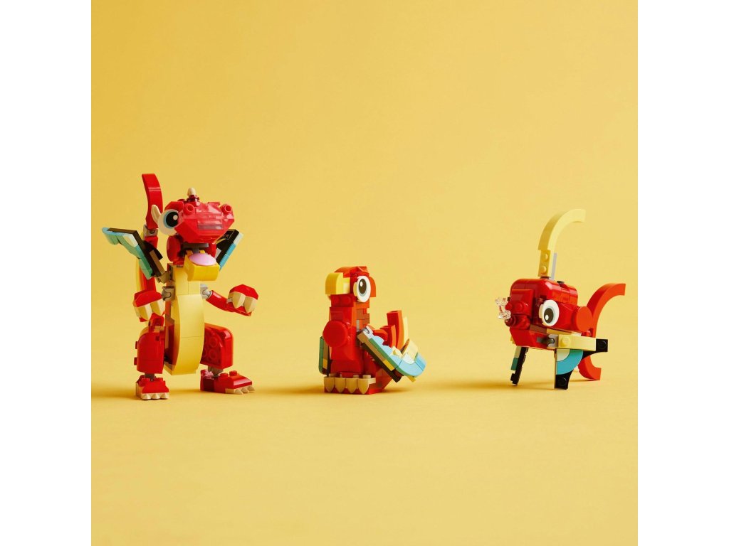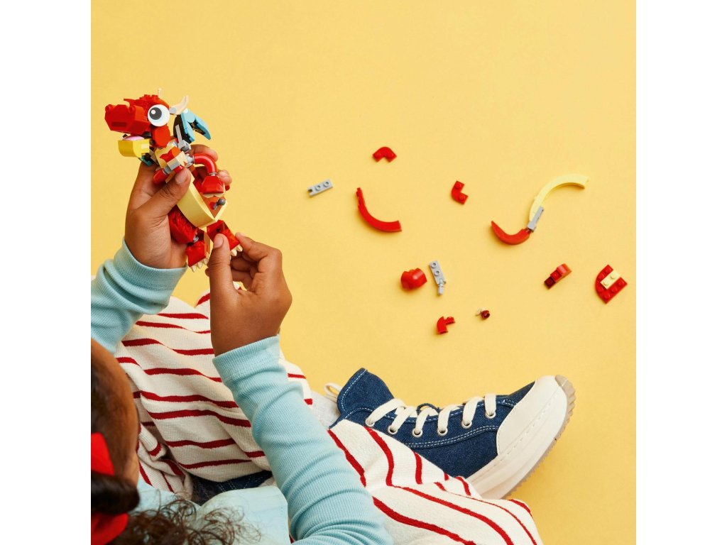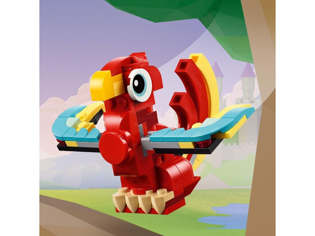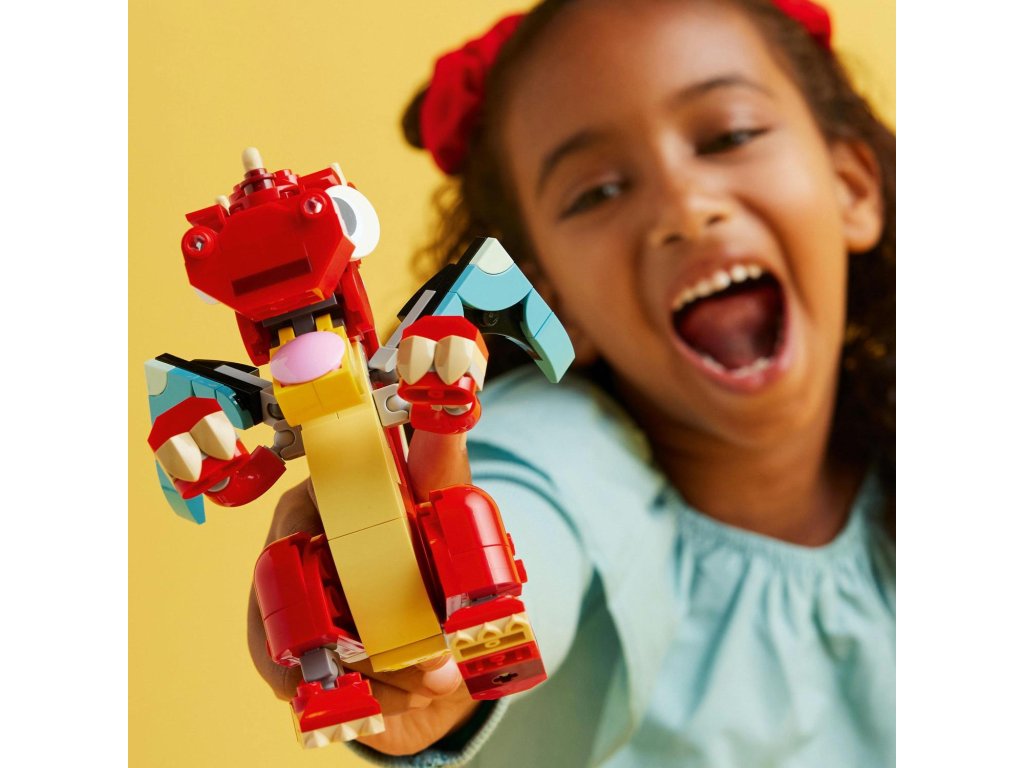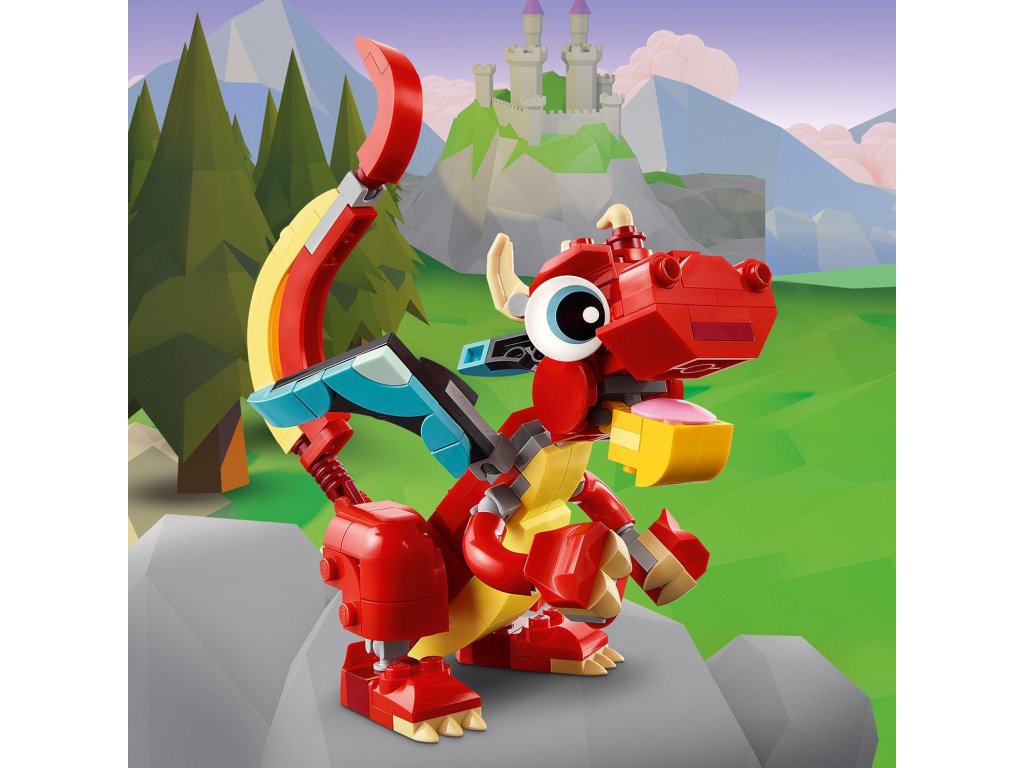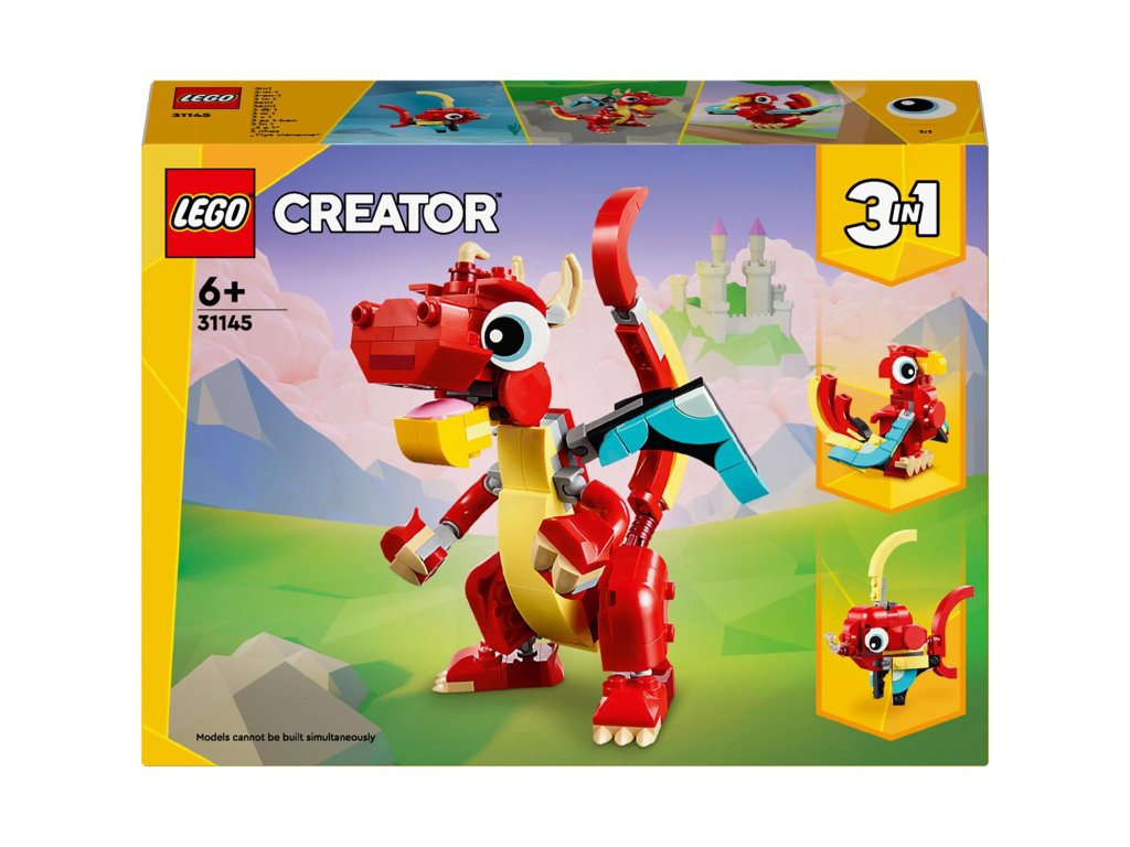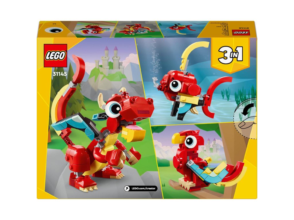 Kreativní děti od 6 let se se stavebnicí LEGO® Creator 3 v 1 (31145) Červený drak vydají do kouzelné země plné příběhů. Postaví si přátelského draka s velkýma očima a pohyblivými pažemi, tlapami, křídly, nohama, chodidly, hlavou a tlamou. Až velkolepá dobrodružství skončí, model si vystaví v pokojíčku.
