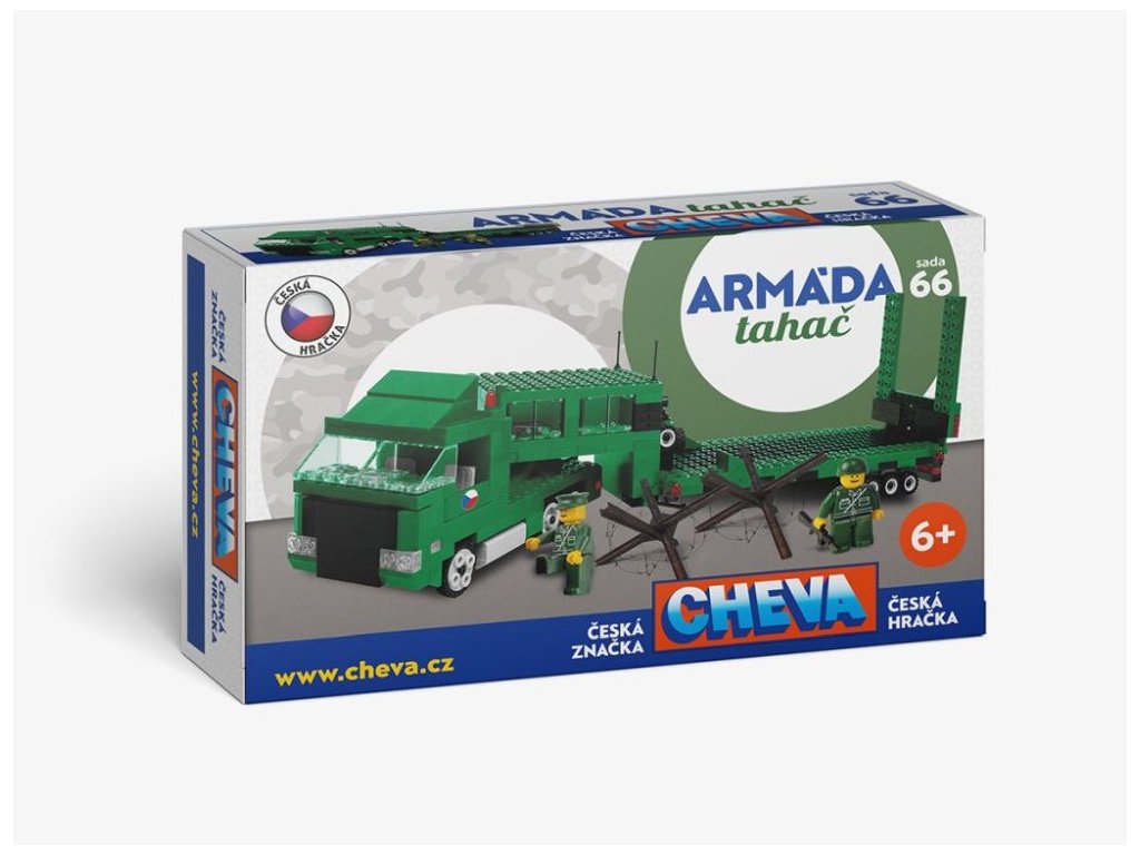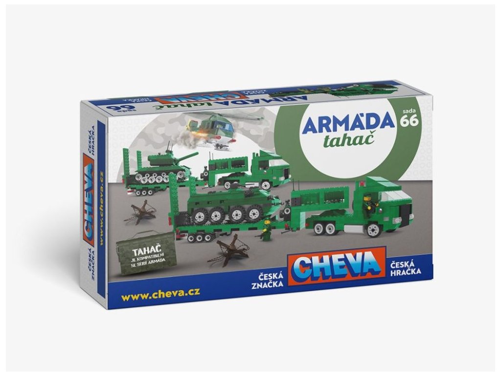 Tato zbrusu nová sada stavebnice Cheva - Tahač je dalším z doplňků k základním verzím stavebnice Cheva. Stavebnice Cheva 66 obsahuje více jak 500 dílků, z nichž lze sestavit Tahač těžké vojenské techniky a přenést se tak do světa válečných bitev.
