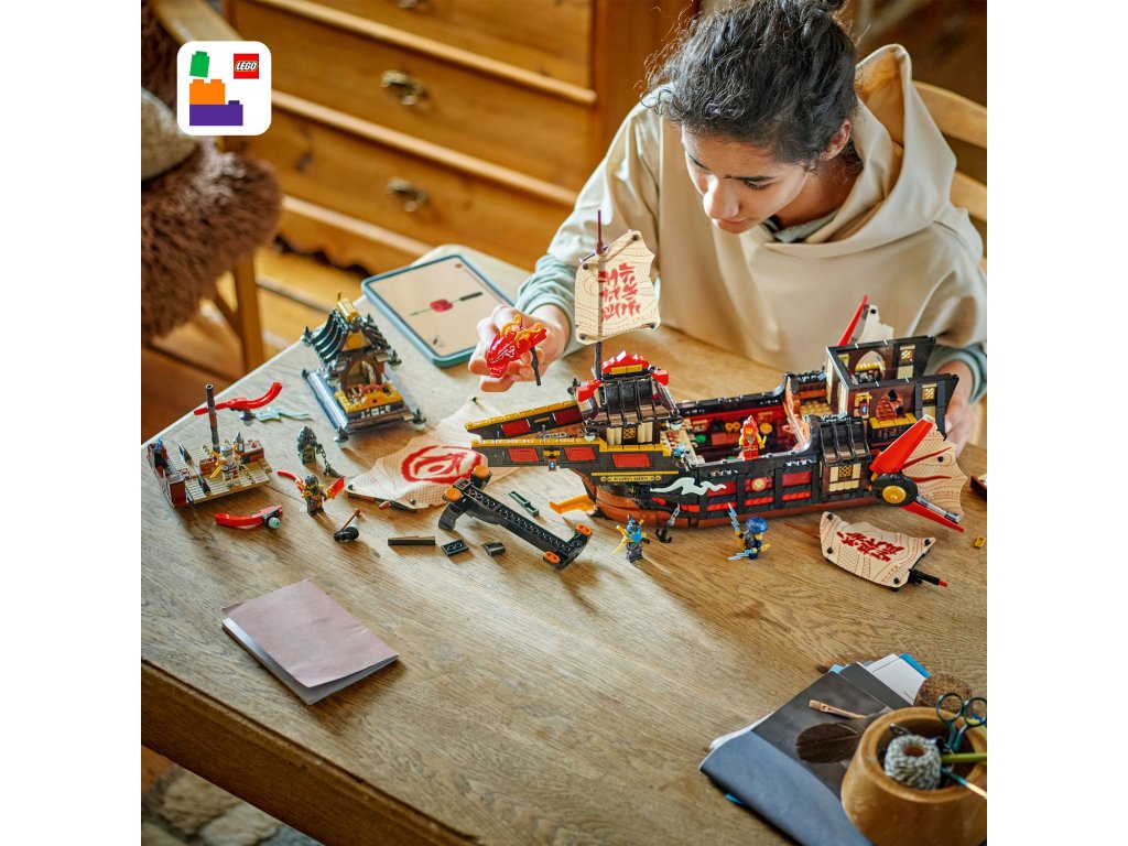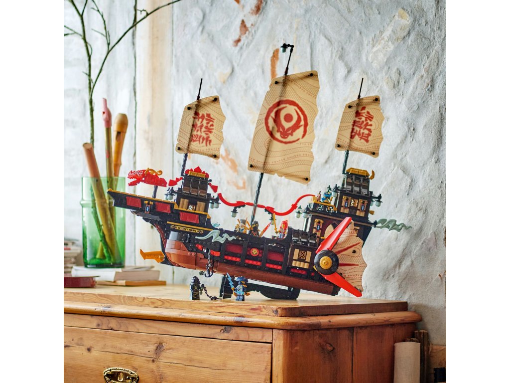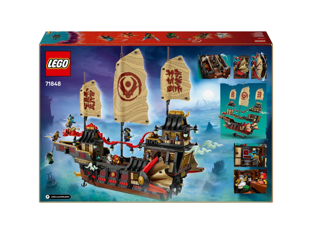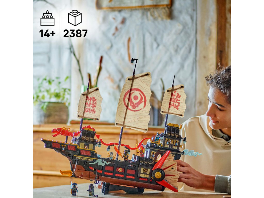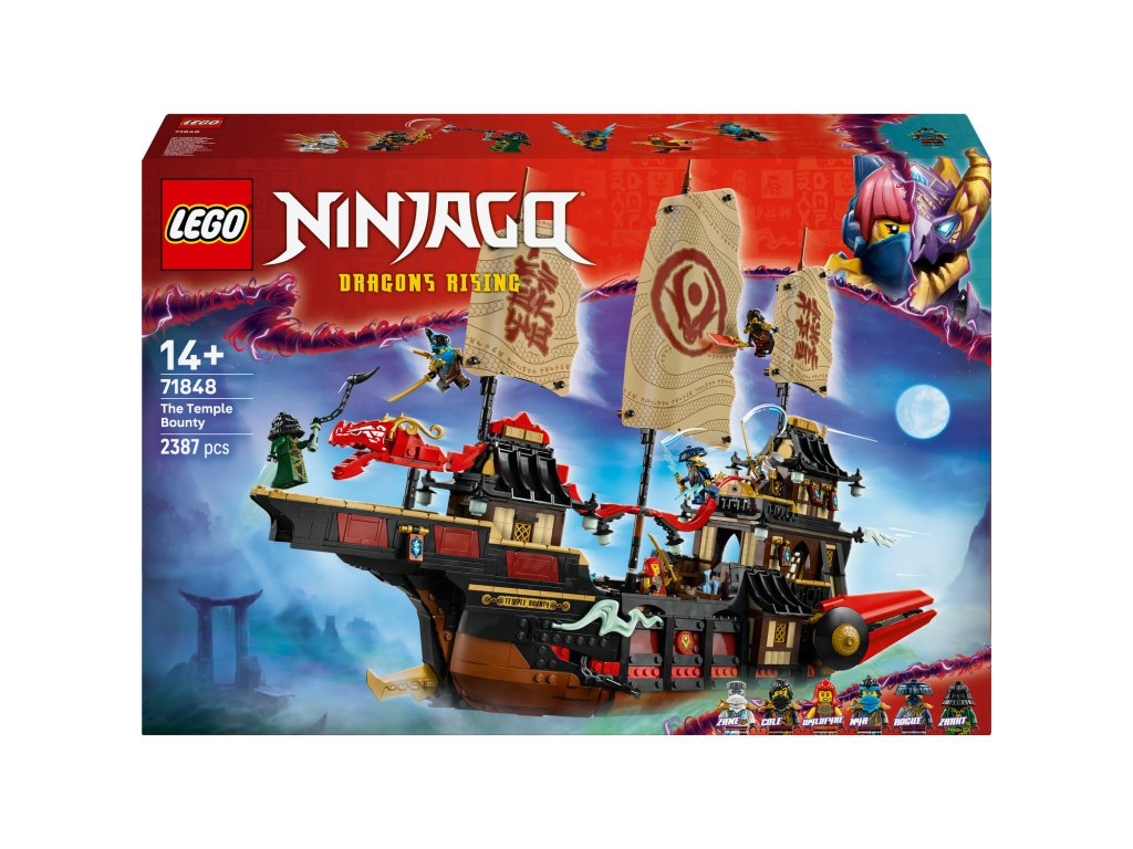 Starší fanoušci NINJAGO® od 14 let čeká úžasný model lodi do sbírky: LEGO® NINJAGO (71848) Chrámová Odměna. Tento velký a propracovaný model lodi je nejnovějším přírůstkem do řady slavných lodí NINJAGO a je plný skvělých detailů a funkcí. Součástíje také podstavec na vystavení,takže fanoušci můžou model snadno vystavit na polici nebo třeba na nočním stolku. Tato interaktivní dobrodružná stavebnice obsahuje vše, co fanoušci nindžů potřebují k tomu, aby si připomněli příběhy z 3. řady televizního seriálu NINJAGO Dračí povstání: ozubené kolo pro otevírání a zavírání plachet, odnímatelné střechy a podlahy pro přístup do interiéru lodi se sushi barem a stolem v hlavní kajutě, který lze sklopit a odhalit tak tajný počítač. Stavebnice obsahujetaké 6 minifigurek: Zanea, Colea, Wyldfyre, Nyu, Roguea a zlotřilého Zarkta, kteří mají vlastní nindžovské zbraně. Nindžové mají průsvitnou čepel, která pomáhá odhalit tajnou mapu na kapitánově stole. Stavebnice obsahuje 2387 dílků.