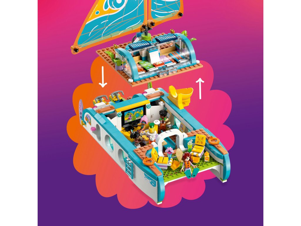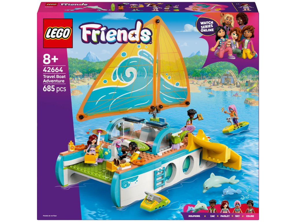 Představujeme vám zábavnou dárkovou stavebnici, která potěší všechny malé cestovatele! Stavebnice LEGO® Friends (42664) Dobrodružství na jachtě pro holky a kluky od 8 let obsahuje 4 minipanenky LEGO Friends a spoustu doplňků pro nápadité hraní. Propracovaná loď je plná realistických prvků, jako je plachta, která se pohybuje, když děti otáčejí kormidlem! Děti si vymyslí příběhy o Paisley, Zacovi, Celine a Sky, kteří se vydali na dobrodružnou plavbu lodí. V lodi najdete prostor na vaření, stolování, odpočinek a spaní – takže se skvěle hodí na vymýšlení nových příběhů. Objevte vířivku s nafukovačkou, herní koutek, prostor na spaní se 4 postelemi, sprchu a toaletu. Odejměte horní část jachty a získejte přístup k propracované kuchyňce s jídelnou. Děti objeví celou řadu doplňků během vaření a stolování s postavami. Mezi další prázdninové doplňky patří dalekohled na pozorování samice delfína a jejího mláděte, 2 vodní skútry, surf, ploutve, herní ovladače a další.